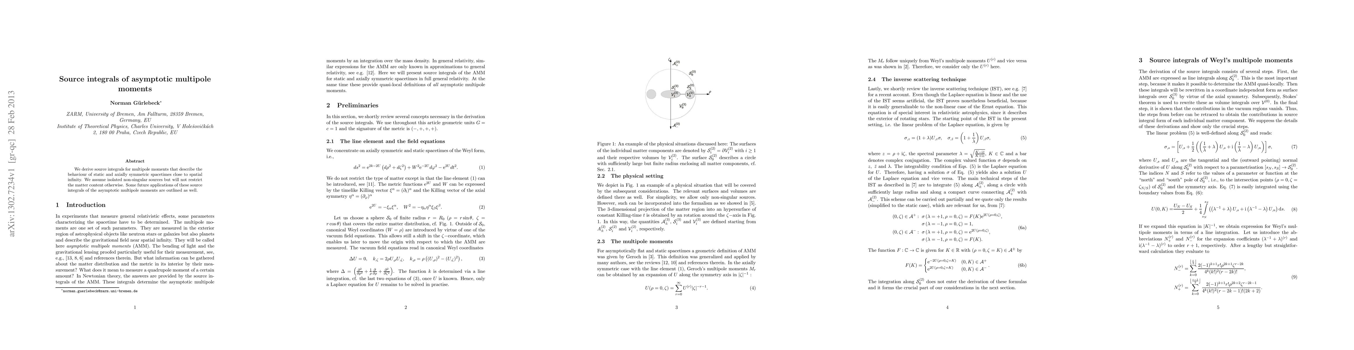 This paper derives source integrals for multipole moments to describe the behavior of static and axially symmetric spacetimes near infinity, assuming isolated non-singular sources. Future applications of these integrals are briefly outlined.