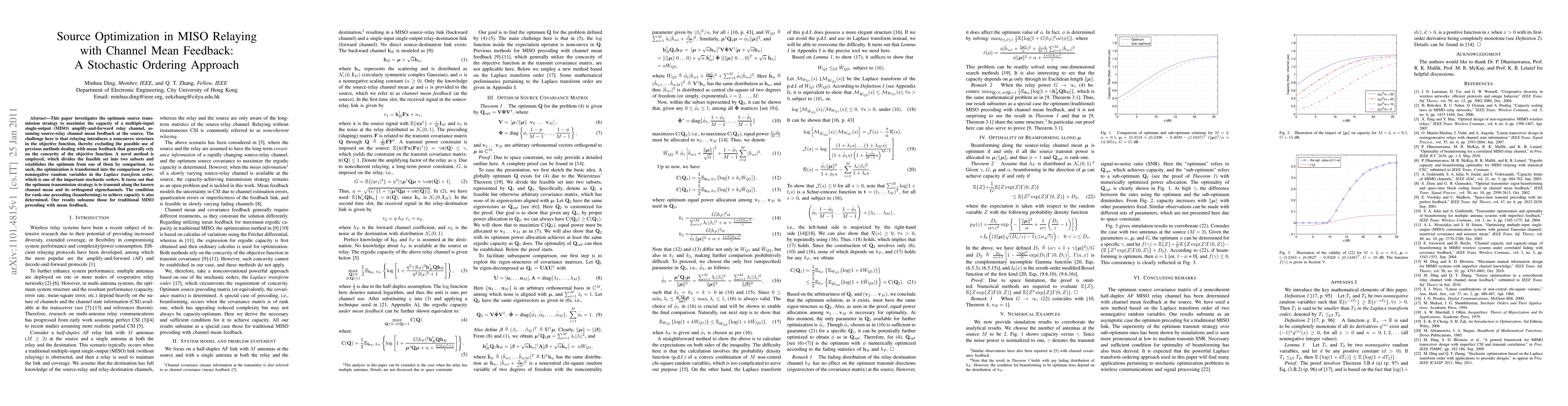 This paper proposes a novel stochastic ordering approach to optimize source transmission in MISO relaying with channel mean feedback, transforming the nonconvex optimization problem into a comparison of stochastic orders. The optimal strategy is found to involve transmitting along the known channel mean and its orthogonal eigenchannels.