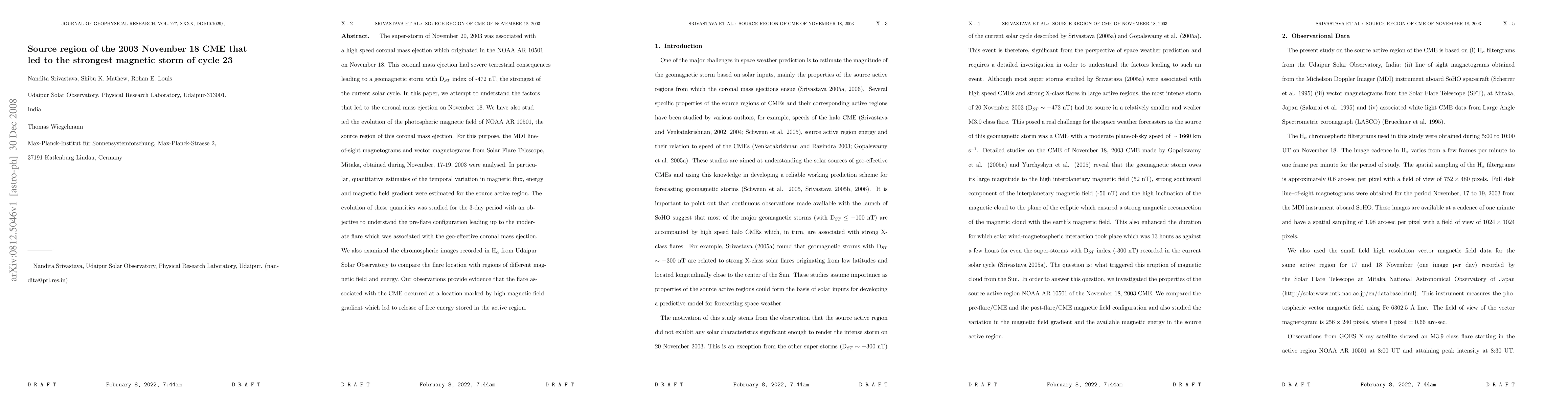 This paper investigates the source region of the November 18, 2003 coronal mass ejection (CME) that caused the strongest geomagnetic storm of solar cycle 23, analyzing the evolution of NOAA AR 10501's photospheric magnetic field and identifying high magnetic field gradients as a key factor in the CME's energy release.