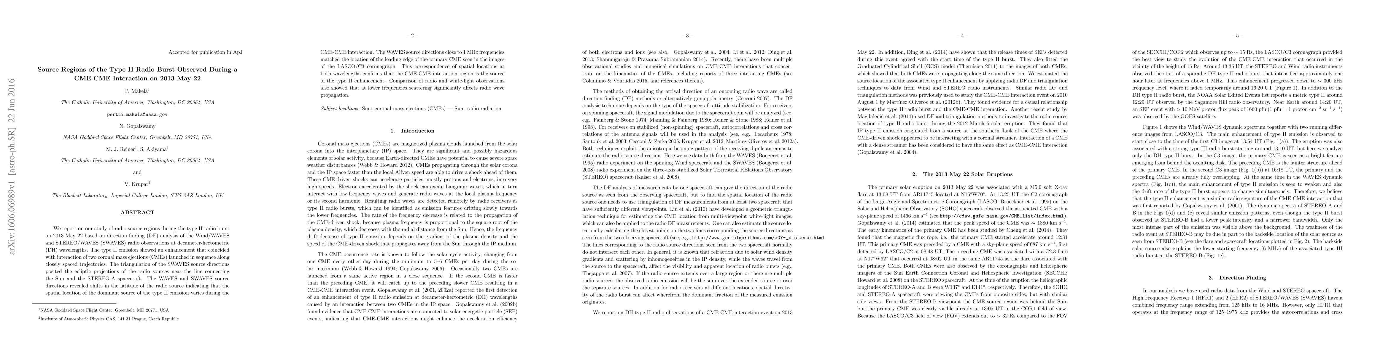 We report on our study of radio source regions during the type II radio burst on 2013 May 22 based on direction finding (DF) analysis of the Wind/WAVES and STEREO/WAVES (SWAVES) radio observations at decameter-hectometric (DH) wavelengths. The type II emission showed an enhancement that coincided with interaction of two coronal mass ejections (CMEs) launched in sequence along closely spaced trajectories. The triangulation of the SWAVES source directions posited the ecliptic projections of the radio sources near the line connecting the Sun and the STEREO-A spacecraft. The WAVES and SWAVES source directions revealed shifts in the latitude of the radio source indicating that the spatial location of the dominant source of the type II emission varies during the CME-CME interaction. The WAVES source directions close to 1 MHz frequencies matched the location of the leading edge of the primary CME seen in the images of the LASCO/C3 coronagraph. This correspondence of spatial locations at both wavelengths confirms that the CME-CME interaction region is the source of the type II enhancement. Comparison of radio and white-light observations also showed that at lower frequencies scattering significantly affects radio wave propagation.