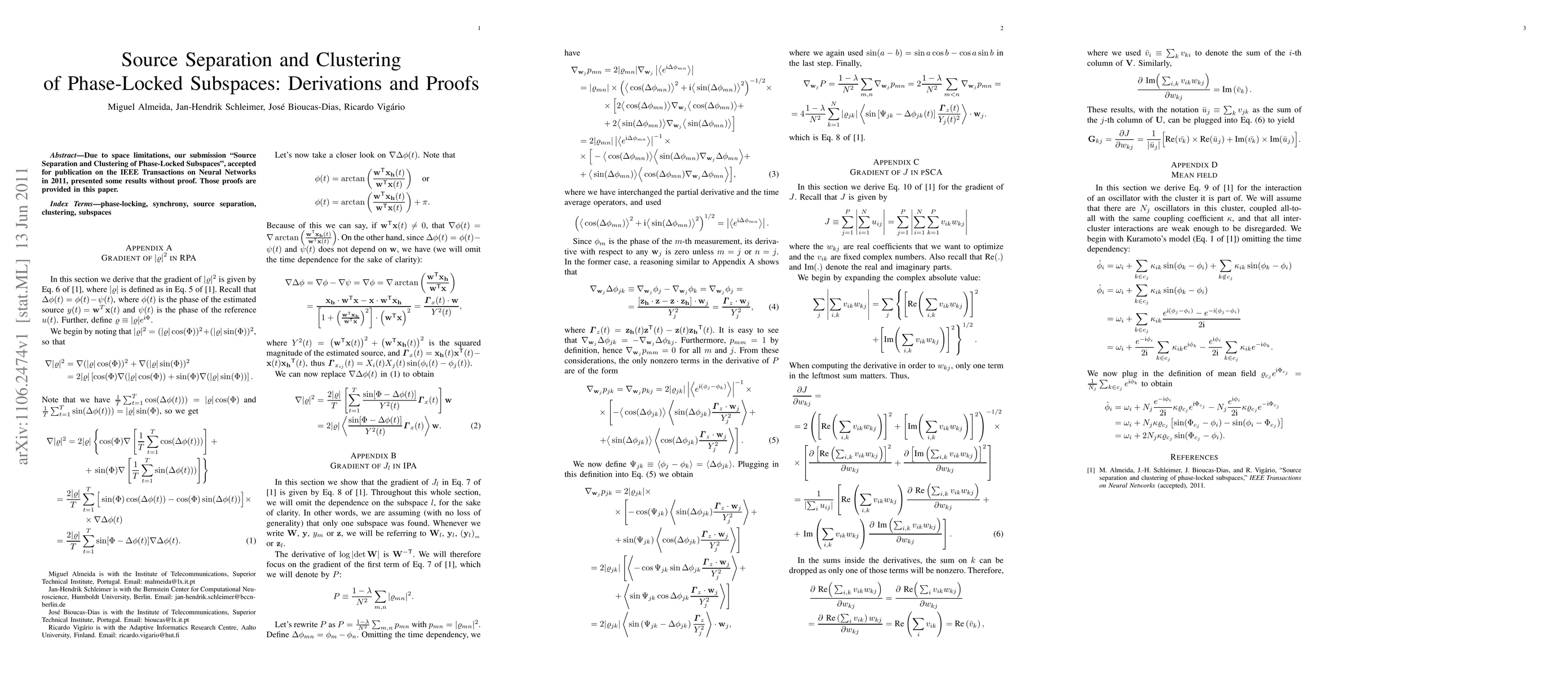 Due to space limitations, our submission "Source Separation and Clustering of Phase-Locked Subspaces", accepted for publication on the IEEE Transactions on Neural Networks in 2011, presented some results without proof. Those proofs are provided in this paper.