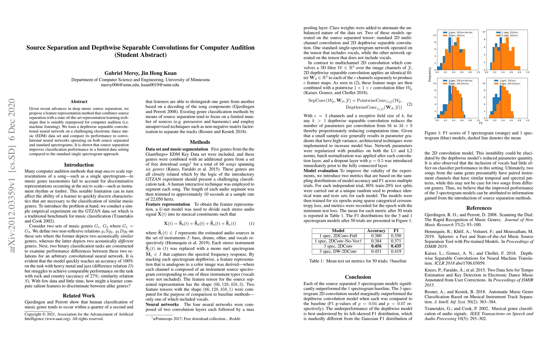 This paper proposes a method combining source separation with depthwise separable convolutions for improved music classification in computer audition. Experiments on an EDM dataset show that source separation enhances classification performance, especially in limited-data scenarios.