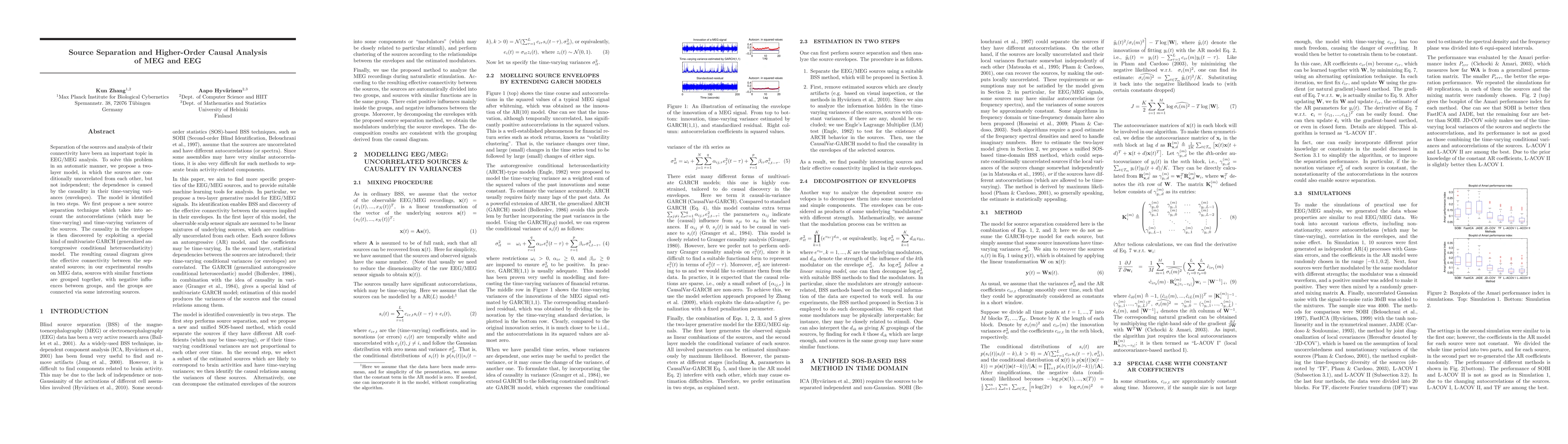 Separation of the sources and analysis of their connectivity have been an important topic in EEG/MEG analysis. To solve this problem in an automatic manner, we propose a two-layer model, in which the sources are conditionally uncorrelated from each other, but not independent; the dependence is caused by the causality in their time-varying variances (envelopes). The model is identified in two steps. We first propose a new source separation technique which takes into account the autocorrelations (which may be time-varying) and time-varying variances of the sources. The causality in the envelopes is then discovered by exploiting a special kind of multivariate GARCH (generalized autoregressive conditional heteroscedasticity) model. The resulting causal diagram gives the effective connectivity between the separated sources; in our experimental results on MEG data, sources with similar functions are grouped together, with negative influences between groups, and the groups are connected via some interesting sources.
