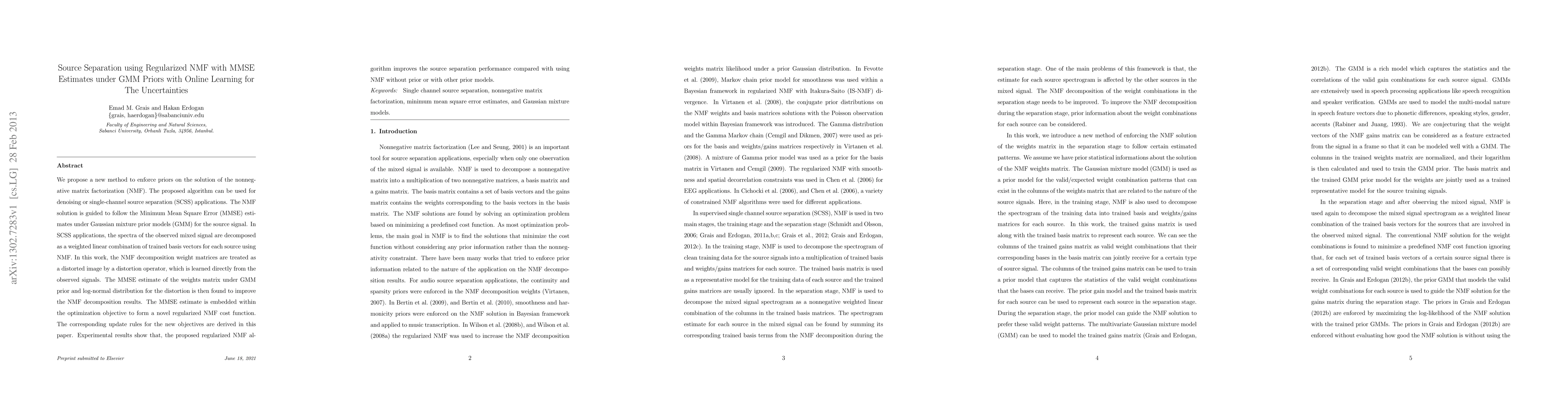 This paper proposes a novel regularized nonnegative matrix factorization (NMF) method that incorporates Minimum Mean Square Error (MMSE) estimates under Gaussian mixture priors for improved source separation. The method enhances NMF decomposition using online learning for uncertainties, leading to better performance in denoising and single-channel source separation applications.