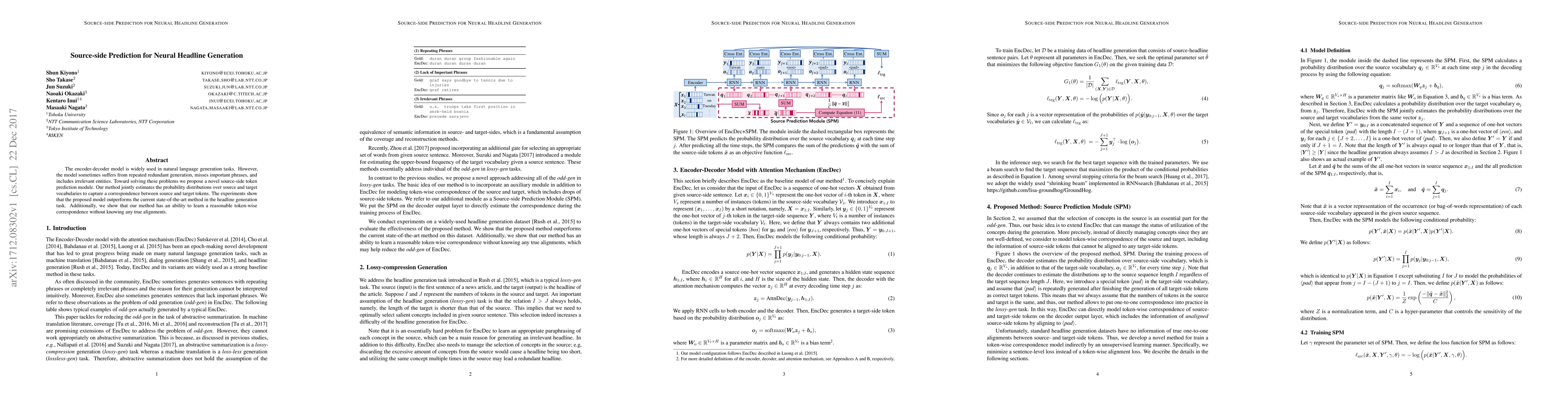 The paper proposes a source-side token prediction module to improve the encoder-decoder model for neural headline generation, addressing issues like redundancy and missing phrases. Experimental results demonstrate superior performance over existing methods and the ability to learn token correspondences without explicit alignments.