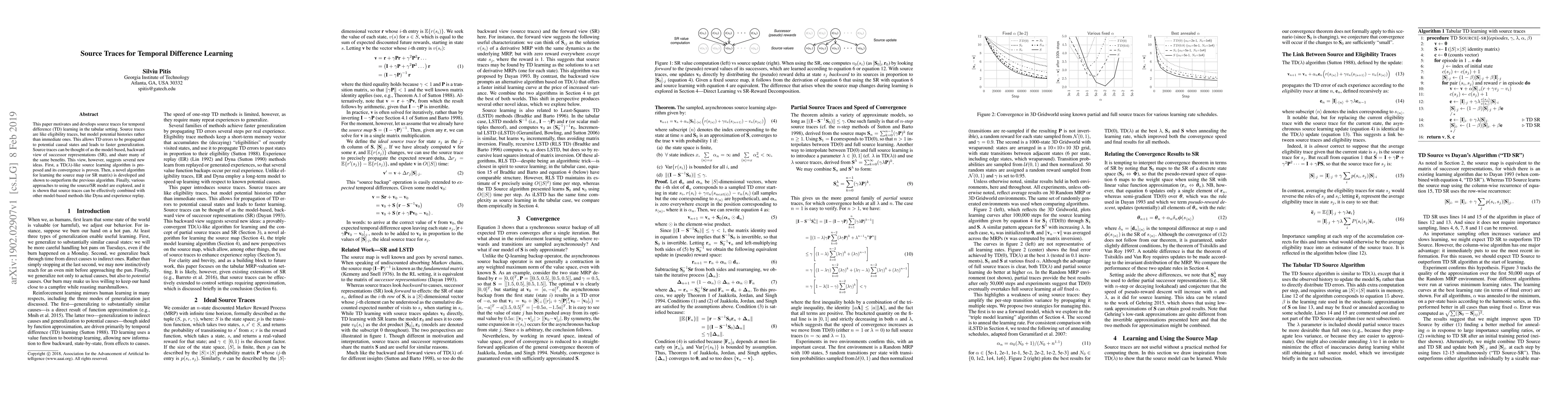 This paper introduces source traces for temporal difference learning, which model potential histories to propagate TD errors to potential causal states, leading to faster generalization. A new TD($\lambda$)-like source learning algorithm is proposed, and a novel source map learning algorithm is developed, demonstrating improved performance over previous methods.