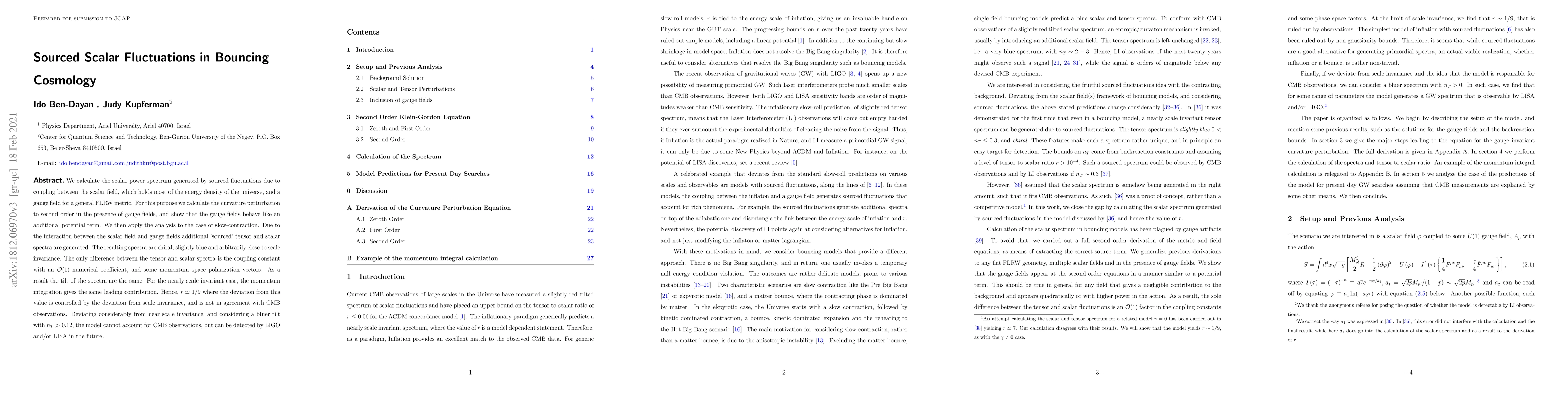 This paper investigates scalar power spectra generated by sourced fluctuations in bouncing cosmology, showing that gauge fields introduce additional potential terms. The resulting chiral, slightly blue, and nearly scale invariant spectra are not consistent with CMB observations but could be detected by future gravitational wave observatories.