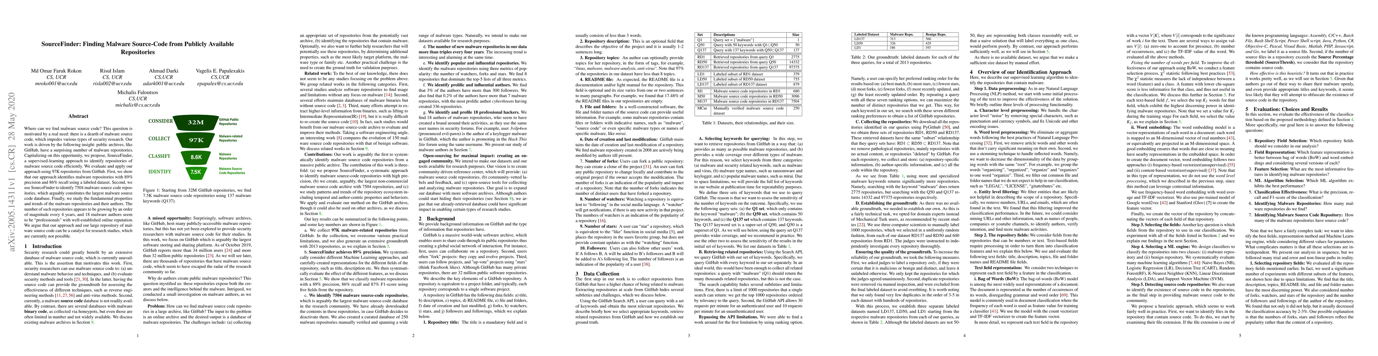 SourceFinder is a supervised-learning tool designed to identify malware source code repositories from public archives like GitHub. It successfully identifies 7,504 malware repositories with 89% precision and 86% recall, creating the largest known database of such code.