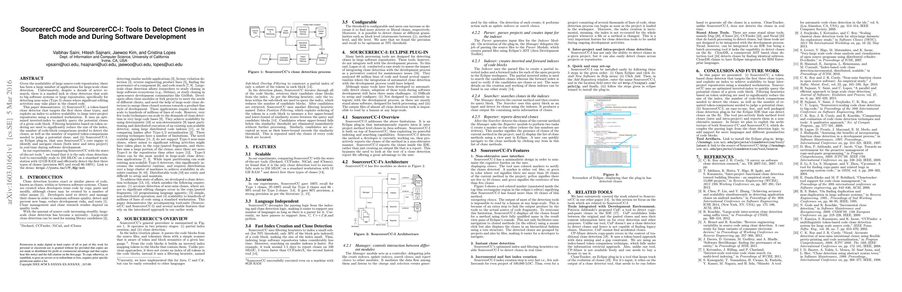 SourcererCC is a scalable token-based clone detector for detecting the first three types of code clones in large repositories, utilizing an optimized inverted index for efficiency. SourcererCC-I is an Eclipse plug-in that leverages SourcererCC's engine to identify and navigate clones in real-time during software development.