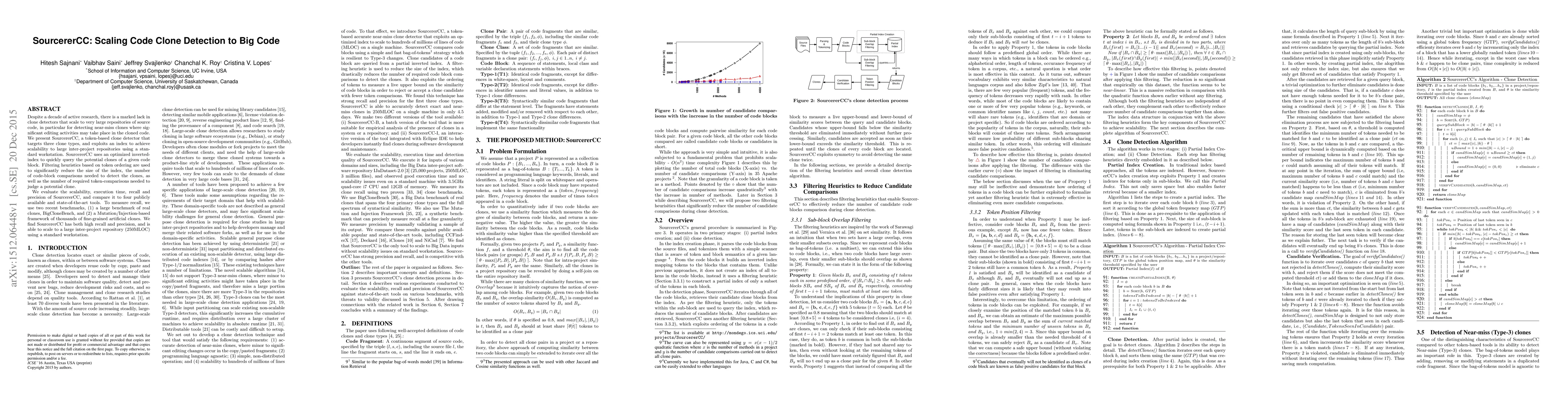 SourcererCC is a token-based code clone detector that uses an optimized partial index and filtering heuristics to scale to large inter-project repositories on a standard workstation. It targets three clone types and employs an inverted-index with token ordering-based heuristics to reduce false positives and improve efficiency.