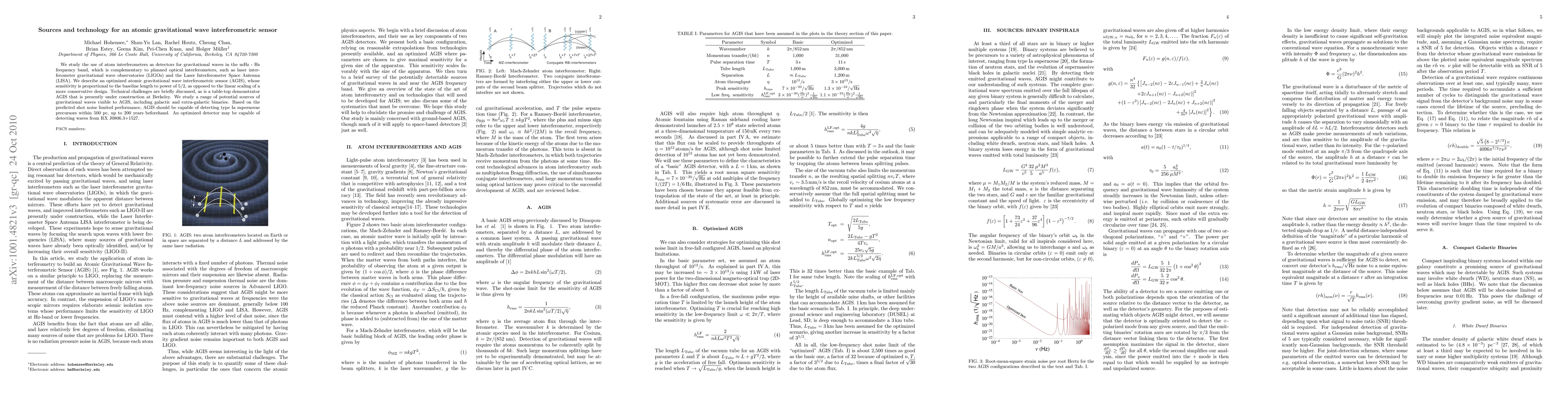 We study the use of atom interferometers as detectors for gravitational waves in the mHz - Hz frequency band, which is complementary to planned optical interferometers, such as laser interferometer gravitational wave observatories (LIGOs) and the Laser Interferometer Space Antenna (LISA). We describe an optimized atomic gravitational wave interferometric sensor (AGIS), whose sensitivity is proportional to the baseline length to power of 5/2, as opposed to the linear scaling of a more conservative design. Technical challenges are briefly discussed, as is a table-top demonstrator AGIS that is presently under construction at Berkeley. We study a range of potential sources of gravitational waves visible to AGIS, including galactic and extra-galactic binaries. Based on the predicted shot noise limited performance, AGIS should be capable of detecting type Ia supernovae precursors within 500 pc, up to 200 years beforehand. An optimized detector may be capable of detecting waves from RX J0806.3+1527.