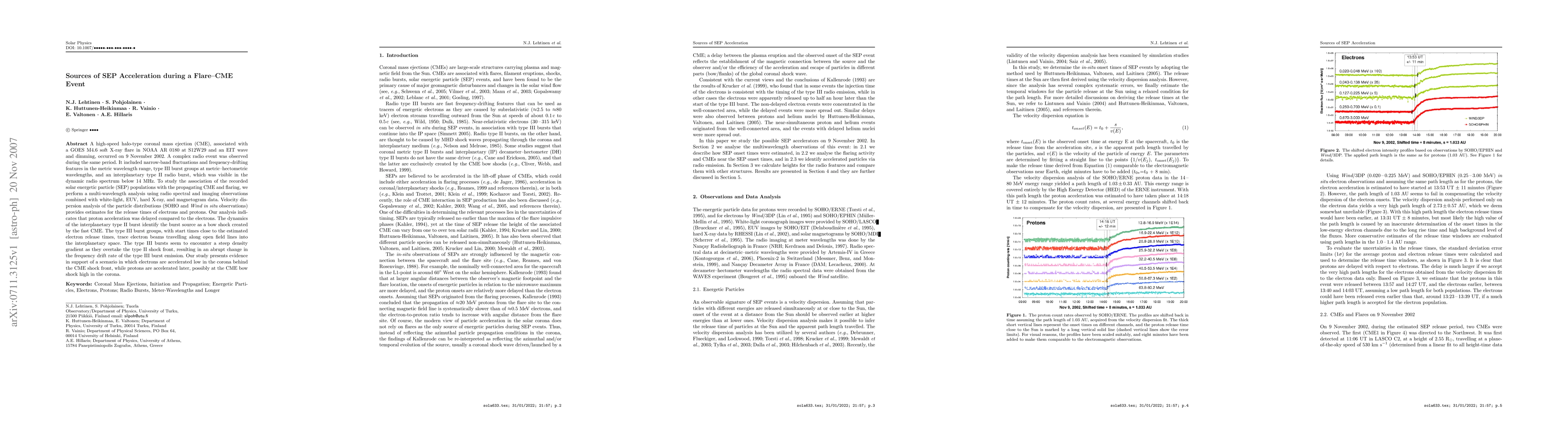 A high-speed halo-type coronal mass ejection (CME), associated with a GOES M4.6 soft X-ray flare in NOAA AR 0180 at S12W29 and an EIT wave and dimming, occurred on 9 November 2002. A complex radio event was observed during the same period. It included narrow-band fluctuations and frequency-drifting features in the metric wavelength range, type III burst groups at metric--hectometric wavelengths, and an interplanetary type II radio burst, which was visible in the dynamic radio spectrum below 14 MHz. To study the association of the recorded solar energetic particle (SEP) populations with the propagating CME and flaring, we perform a multi-wavelength analysis using radio spectral and imaging observations combined with white-light, EUV, hard X-ray, and magnetogram data. Velocity dispersion analysis of the particle distributions (SOHO and Wind in situ observations) provides estimates for the release times of electrons and protons. Our analysis indicates that proton acceleration was delayed compared to the electrons. The dynamics of the interplanetary type II burst identify the burst source as a bow shock created by the fast CME. The type III burst groups, with start times close to the estimated electron release times, trace electron beams travelling along open field lines into the interplanetary space. The type III bursts seem to encounter a steep density gradient as they overtake the type II shock front, resulting in an abrupt change in the frequency drift rate of the type III burst emission. Our study presents evidence in support of a scenario in which electrons are accelerated low in the corona behind the CME shock front, while protons are accelerated later, possibly at the CME bow shock high in the corona.