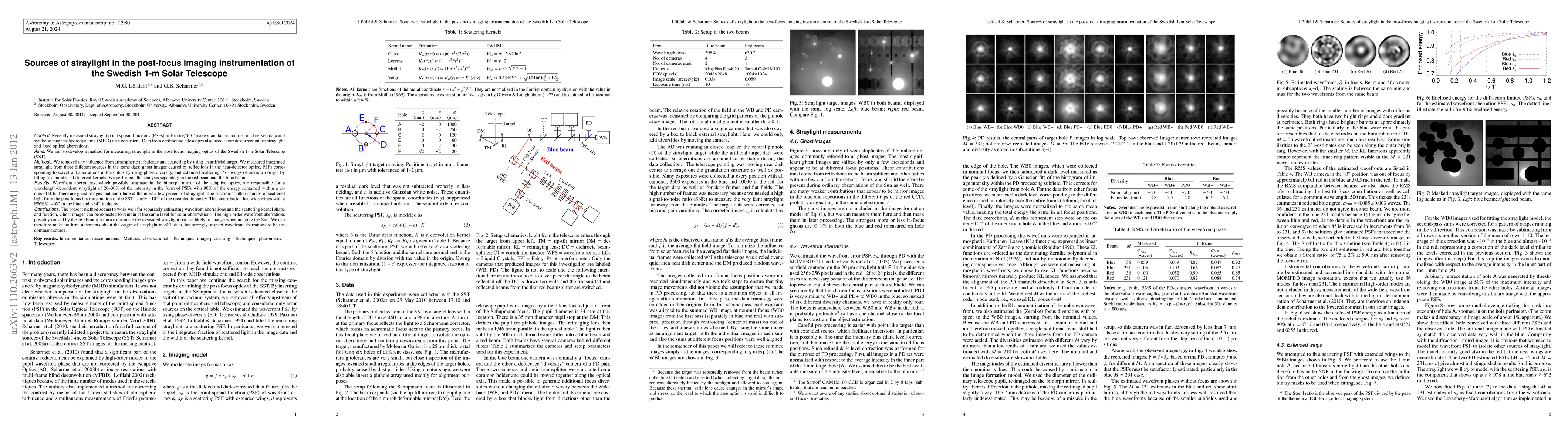 Recently measured straylight PSFs in Hinode/SOT make granulation contrast in observed data and synthetic MHD data consistent. Data from earthbound telescopes also need accurate correction for straylight and fixed optical aberrations. We aim to develop a method for measuring straylight in the post-focus imaging optics of the SST. We removed any influence from atmospheric turbulence and scattering by using an artificial target. We measured integrated straylight from three different sources in the same data: ghost images caused by reflections in the near-detector optics, PSFs corresponding to wavefront aberrations in the optics by using phase diversity, and extended scattering PSF wings of unknown origin by fitting to a number of different kernels. We performed the analysis separately in the red and blue beams. Wavefront aberrations, which possibly originate in the bimorph mirror of the adaptive optics, are responsible for a wavelength-dependent straylight of 20-30% of the intensity in the form of PSFs with 90% of the energy contained within a radius of 0.6". There are ghost images that contribute at the most a few % of straylight. The fraction of other sources of scattered light from the post-focus instrumentation of the SST is only \sim10^-3 of the recorded intensity. This contribution has wide wings with FWHM \sim16" in the blue and \sim34" in the red. The present method seems to work well for separately estimating wavefront aberrations and the scattering kernel shape and fraction. Ghost images can be expected at the same level for solar observations. The high-order wavefront aberrations possibly caused by the AO bimorph mirror dominate the measured straylight but are likely to change when imaging the Sun. We can therefore make no firm statements about the origin of straylight in SST data, but strongly suspect wavefront aberrations to be the dominant source.
