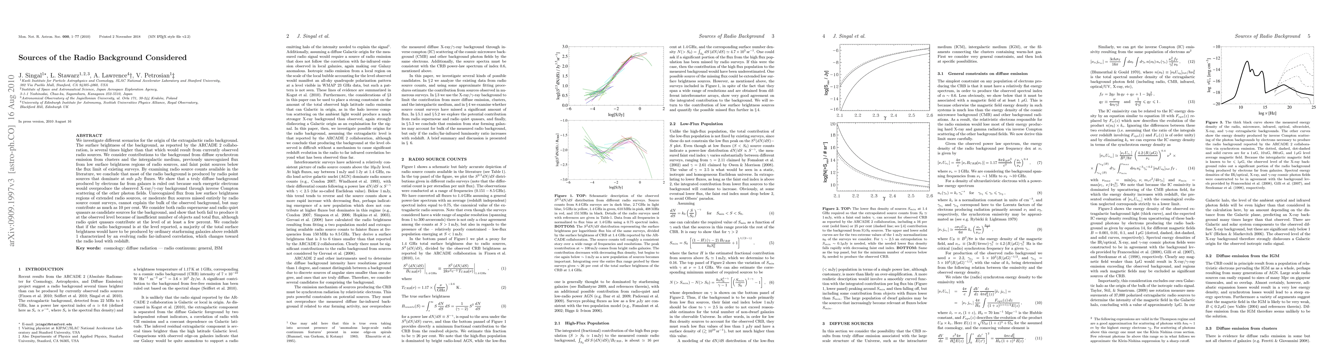 We investigate different scenarios for the origin of the extragalactic radio background. The surface brightness of the background, as reported by the ARCADE 2 collaboration, is several times higher than that which would result from currently observed radio sources. We consider contributions to the background from diffuse synchrotron emission from clusters and the intergalactic medium, previously unrecognized flux from low surface brightness regions of radio sources, and faint point sources below the flux limit of existing surveys. By examining radio source counts available in the literature, we conclude that most of the radio background is produced by radio point sources that dominate at sub microJy fluxes. We show that a truly diffuse background produced by electrons far from galaxes is ruled out because such energetic electrons would overproduce the obserevd X-ray/gamma-ray background through inverse Compton scattering of the other photon fields. Unrecognized flux from low surface brightness regions of extended radio sources, or moderate flux sources missed entirely by radio source count surveys, cannot explain the bulk of the observed background, but may contribute as much as 10 per cent. We consider both radio supernovae and radio quiet quasars as candidate sources for the background, and show that both fail to produce it at the observed level because of insufficient number of objects and total flux, although radio quiet quasars contribute at the level of at least a few percent. We conclude that if the radio background is at the level reported, a majority of the total surface brightness would have to be produced by ordinary starforming galaxies above redshift 1 characterized by an evolving radio far-infrared correlation, which changes toward the radio loud with redshift.