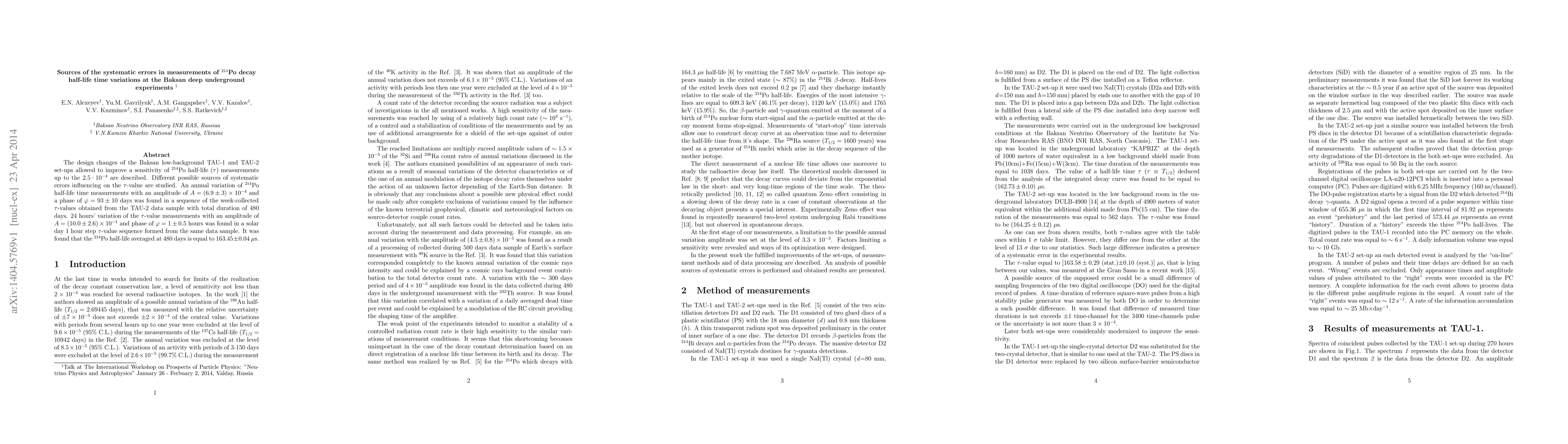 The design changes of the Baksan low-background TAU-1 and TAU-2 set-ups allowed to improve a sensitivity of Po-214 half-life (\tau) measurements up to the 2.5 x 10^{-4} are described. Different possible sources of systematic errors influencing on the $\tau$-value are studed. An annual variation of Po-214 half-life time measurements with an amplitude of A=(6.9 \pm 3) x 10^{-4} and a phase of (\phi=93 \pm 10) days was found in a sequence of the week-collected \tau-values obtained from the TAU-2 data sample with total duration of 480 days. 24 hours' variation of the \tau-value measurements with an amplitude of A=(10.0 \pm 2.6) x 10^{-4} and phase of (\phi=1 \pm 0.5) hours was found in a solar day 1 hour step \tau-value sequence formed from the same data sample. It was found that the Po-214 half-life averaged at 480 days is equal to (163.45 \pm 0.04) mks.