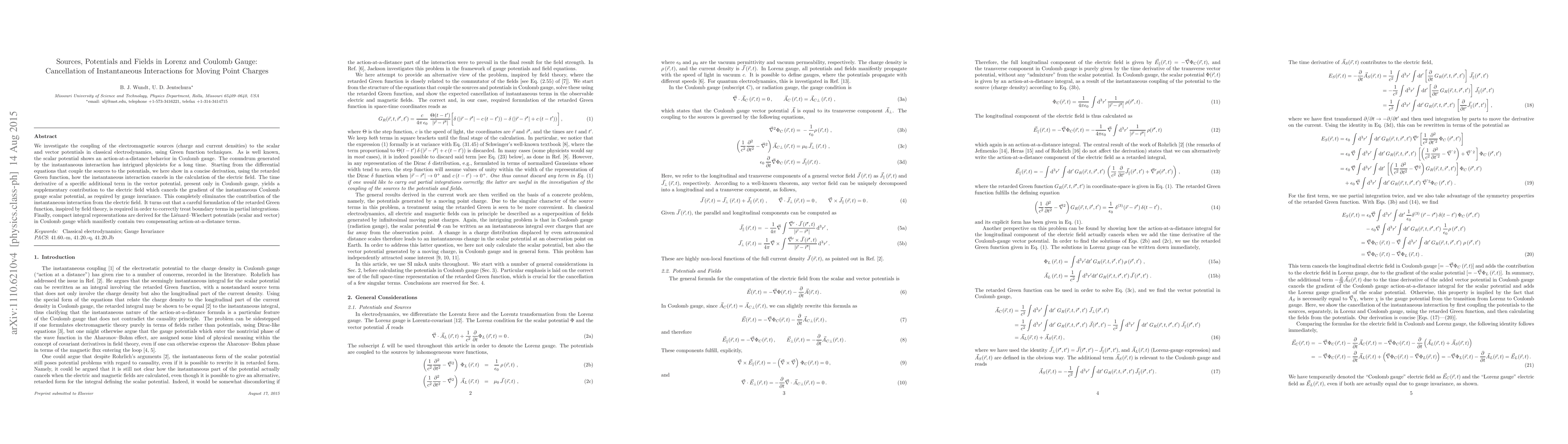 This paper investigates the coupling of electromagnetic sources to potentials in classical electrodynamics, revealing how instantaneous interactions cancel in the electric field calculation using the retarded Green function. It demonstrates gauge invariance by showing that the gradient of the instantaneous Coulomb gauge scalar potential is canceled by a supplementary vector potential term, leading to compact integral representations for Lienard-Wiechert potentials.