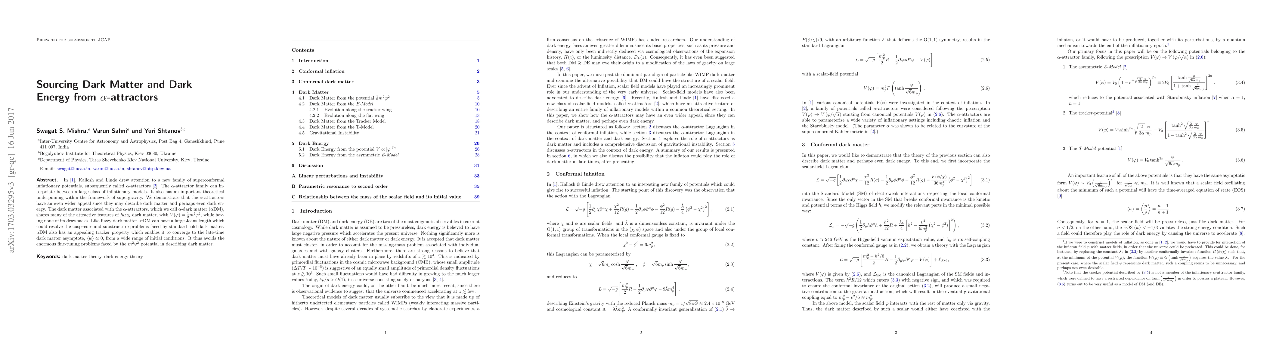 This paper explores the potential of $\alpha$-attractors, a new class of superconformal inflationary potentials, to describe both dark matter and dark energy. The proposed $\alpha$-dark matter ($\alpha$DM) shares beneficial features of fuzzy dark matter without its drawbacks, potentially resolving issues like the cusp-core and substructure problems in standard cold dark matter models.