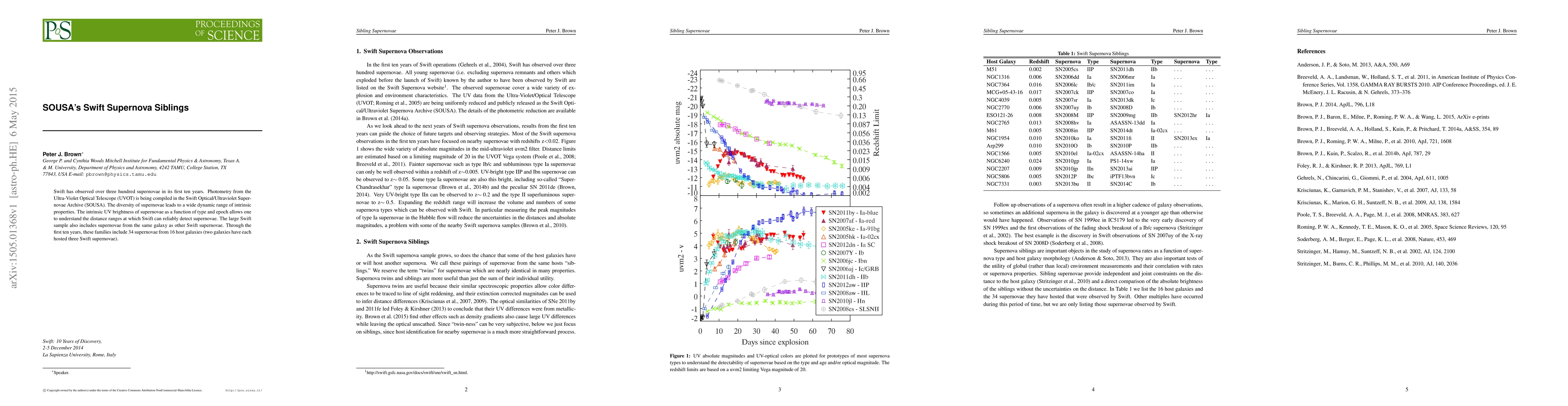 Swift has observed over three hundred supernovae in its first ten years. Photometry from the Ultra-Violet Optical Telescope (UVOT) is being compiled in the Swift Optical/Ultraviolet Supernovae Archive (SOUSA). The diversity of supernovae leads to a wide dynamic range of intrinsic properties. The intrinsic UV brightness of supernovae as a function of type and epoch allows one to understand the distance ranges at which Swift can reliably detect supernovae. The large Swift sample also includes supernovae from the same galaxy as other Swift supernovae. Through the first ten years, these families include 34 supernovae from 16 host galaxies (two galaxies have each hosted three Swift supernovae).