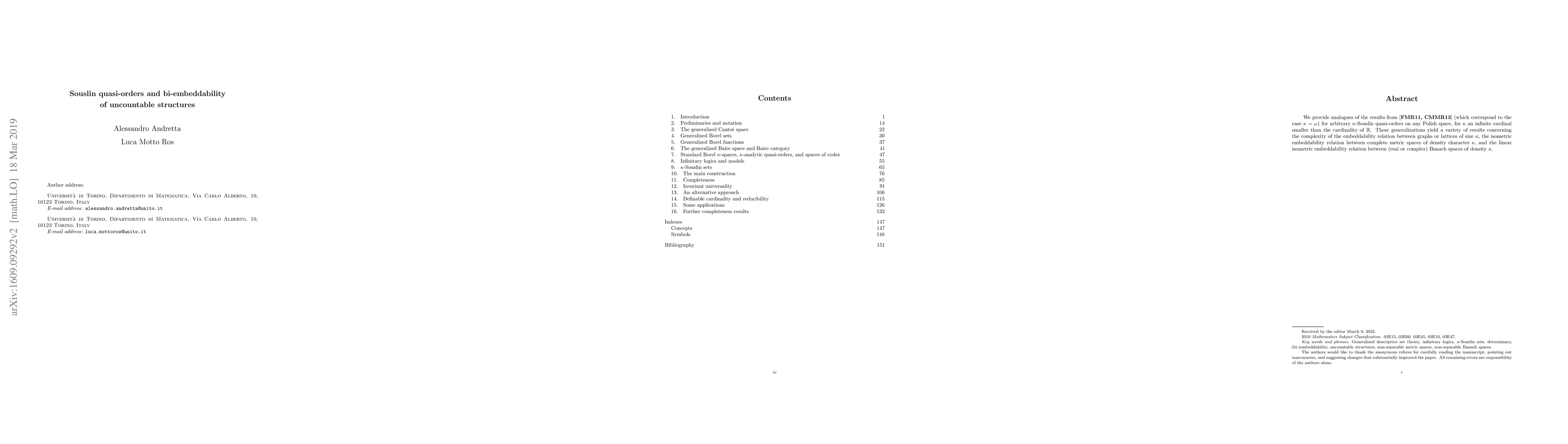 This paper generalizes results from [FMR11, CMMR13] to $\kappa$-Souslin quasi-orders on Polish spaces for infinite cardinals $\kappa < |\mathbb{R}|$, exploring the bi-embeddability of uncountable structures like graphs, lattices, and Banach spaces. The study reveals insights into the complexity of embedding relations among these structures.