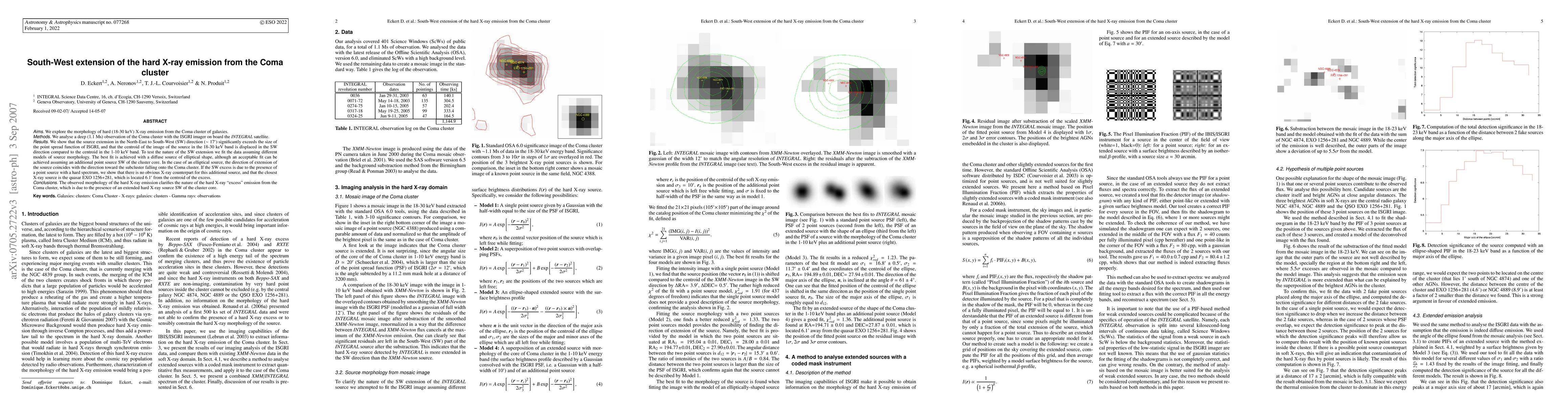 This paper investigates the morphology of hard X-ray emission from the Coma cluster, revealing an extension in the South-West direction that exceeds the instrument's point spread function. The best fit model suggests an elliptical source, possibly linked to a subcluster, while an additional point source cannot be conclusively identified.