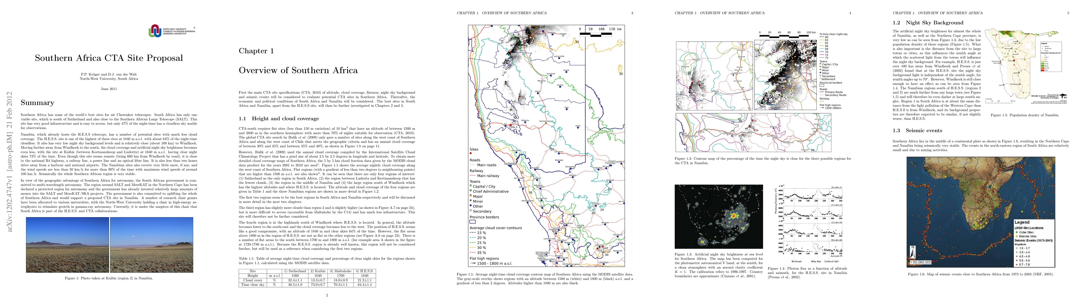 Southern Africa has some of the world's best sites for air Cherenkov telescopes. South Africa has only one viable site, which is south of Sutherland and also close to the Southern African Large Telescope (SALT). This site has very good infrastructure and is easy to access, but only 47% of the night-time has a cloudless sky usable for observations. Namibia, which already hosts the H.E.S.S telescope, has a number of potential sites with much less cloud coverage. The H.E.S.S. site is one of the highest of these sites at 1840 m a.s.l. with about 64% of the night-time cloudless. It also has very low night sky background levels and is relatively close (about 100 km) to Windhoek. Moving further away from Windhoek to the south, the cloud coverage and artificial night sky brightness becomes even less, with the site at Kuibis (between Keetmanshoop and Luderitz) at 1640 m a.s.l. having clear night skies 73% of the time. Even though this site seems remote (being 660 km from Windhoek by road), it is close to the national B4 highway, a railway line, a power line and an optical fiber line. It is also less than two hours drive away from a harbour and national airports. The Namibian sites also receive very little snow, if any, and the wind speeds are less than 50 km/h for more than 90% of the time with maximum wind speeds of around 100 km/h. Seismically the whole Southern African region is very stable.