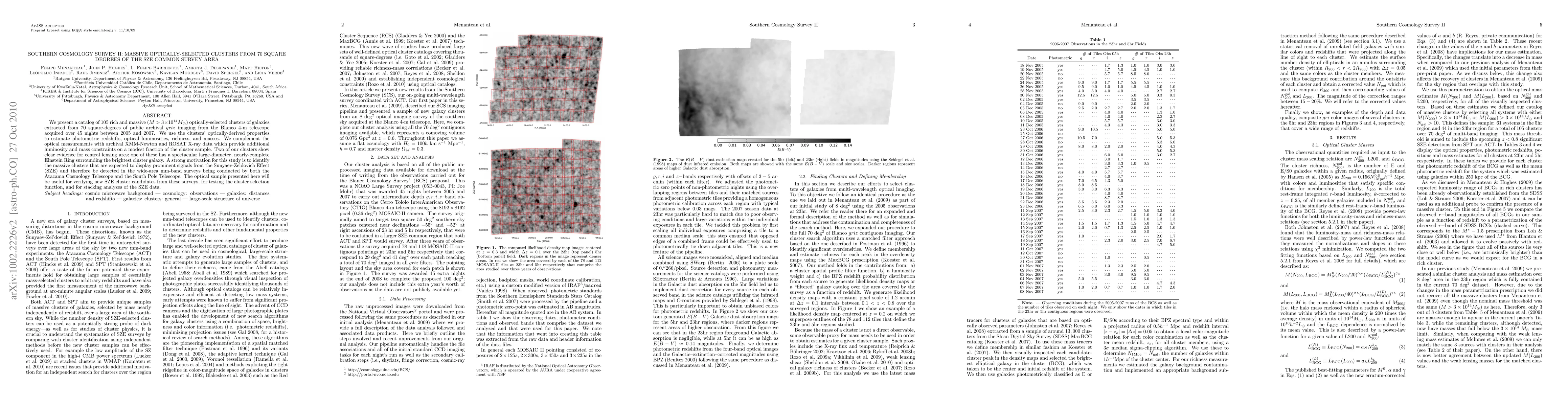 We present a catalog of 105 rich and massive ($M>3\times10^{14}M_{\sun}$) optically-selected clusters of galaxies extracted from 70 square-degrees of public archival griz imaging from the Blanco 4-m telescope acquired over 45 nights between 2005 and 2007. We use the clusters' optically-derived properties to estimate photometric redshifts, optical luminosities, richness, and masses. We complement the optical measurements with archival XMM-Newton and ROSAT X-ray data which provide additional luminosity and mass constraints on a modest fraction of the cluster sample. Two of our clusters show clear evidence for central lensing arcs; one of these has a spectacular large-diameter, nearly-complete Einstein Ring surrounding the brightest cluster galaxy. A strong motivation for this study is to identify the massive clusters that are expected to display prominent signals from the Sunyaev-Zeldovich Effect (SZE) and therefore be detected in the wide-area mm-band surveys being conducted by both the Atacama Cosmology Telescope and the South Pole Telescope. The optical sample presented here will be useful for verifying new SZE cluster candidates from these surveys, for testing the cluster selection function, and for stacking analyzes of the SZE data.