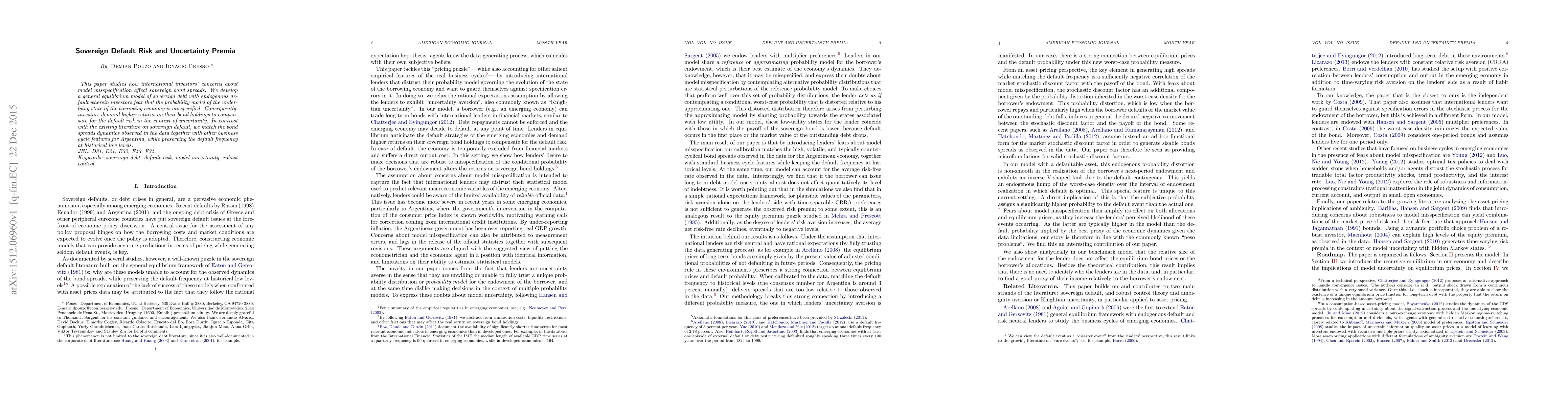 International investors demand higher returns on sovereign bonds due to concerns about model misspecification affecting default risk in uncertain economic environments. The study matches bond spread dynamics with business cycle features for Argentina while preserving historical low default frequencies.