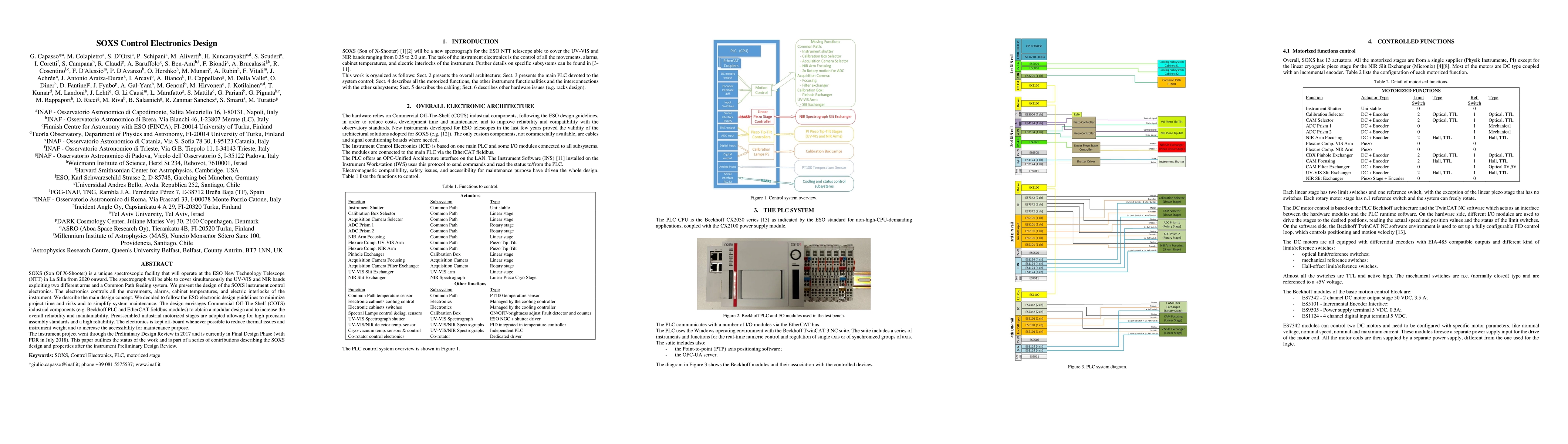 The paper describes the design of the SOXS control electronics, adhering to ESO electronic design guidelines and using Commercial Off-The-Shelf (COTS) industrial components such as Beckhoff PLC and EtherCAT fieldbus modules for a modular, reliable, and maintainable system.