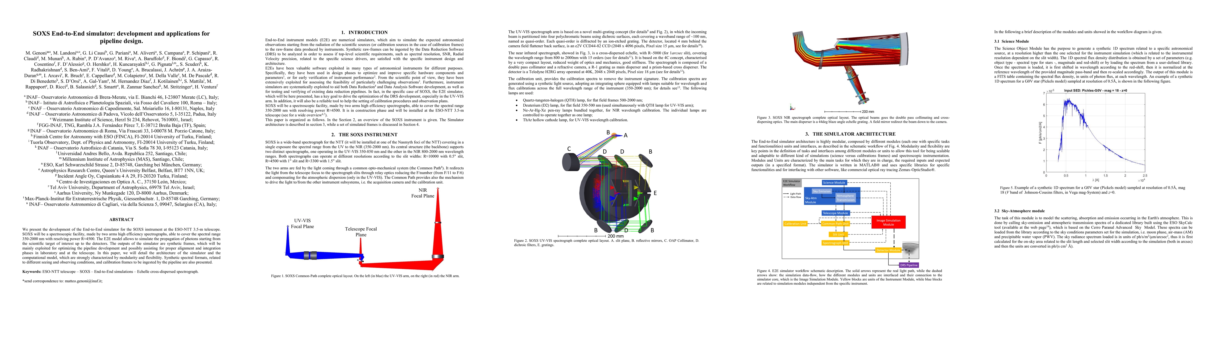This paper details the development of the End-to-End simulator for the SOXS spectroscopic instrument, designed for the ESO-NTT telescope. The simulator generates synthetic frames to optimize pipeline development and assist in alignment and integration phases, showcasing modularity and flexibility in its architecture and computational model.