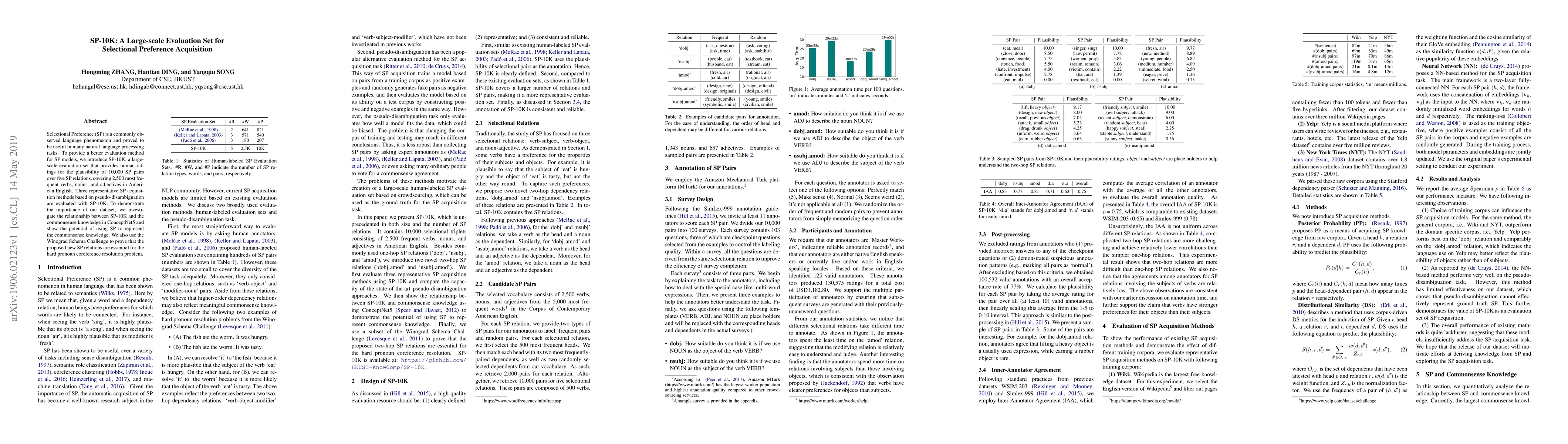 The research introduces SP-10K, a large-scale evaluation set for selectional preference acquisition, which provides human ratings for the plausibility of 10,000 SP pairs over five SP relations.