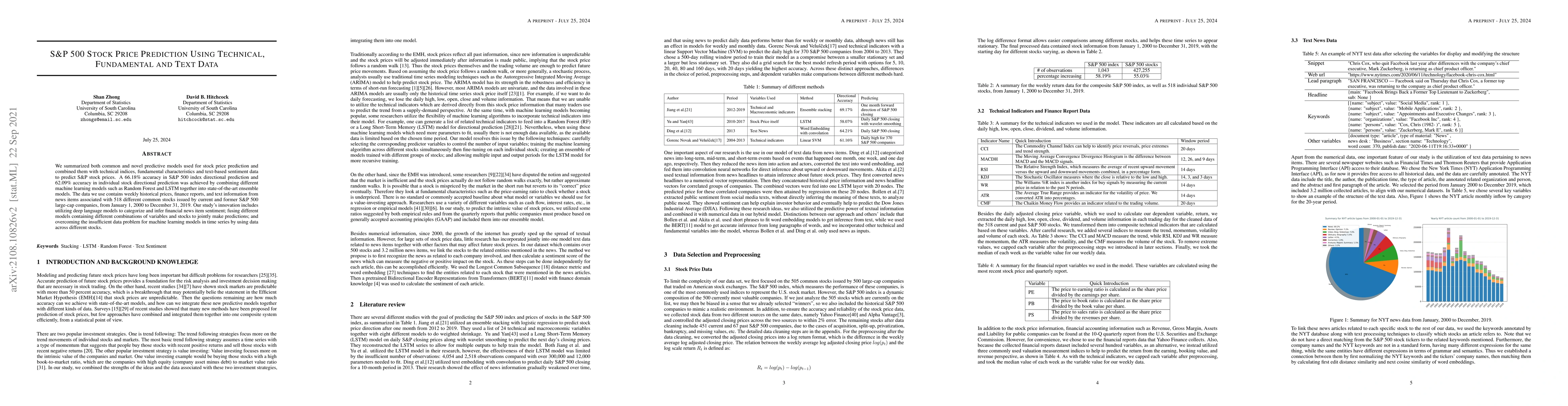 The research combined technical indices, fundamental characteristics, and text-based sentiment data from news items associated with 518 different common stocks issued by current and former S&P 500 large-cap companies, from January 1, 2000, to December 31, 2019. Machine learning models such as Random Forest and LSTM were used and combined into ensemble models.