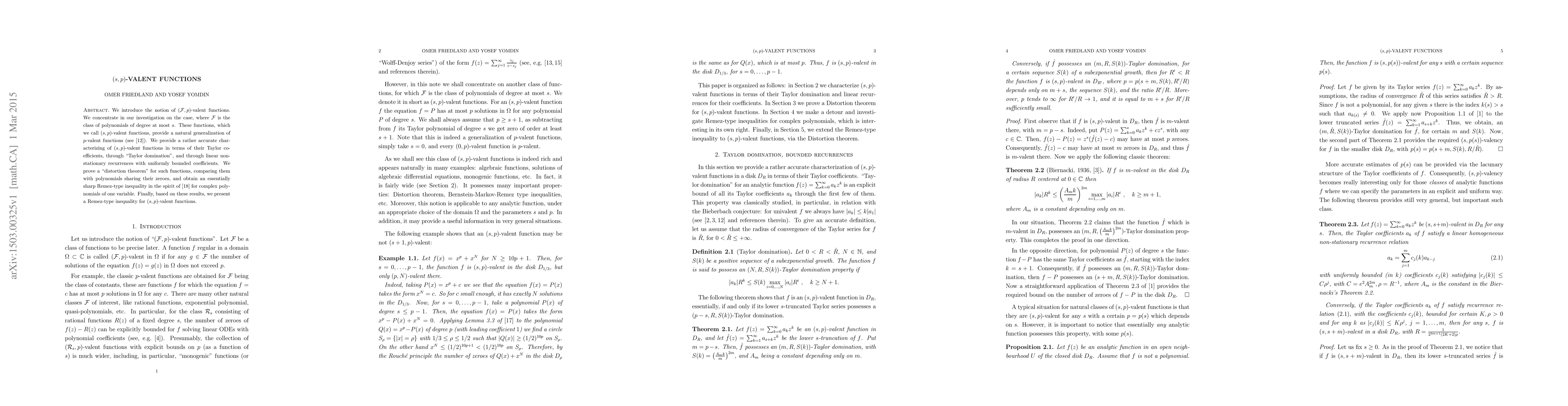 We introduce the notion of $(\mathcal F,p)$-valent functions. We concentrate in our investigation on the case, where $\mathcal F$ is the class of polynomials of degree at most $s$. These functions, which we call $(s,p)$-valent functions, provide a natural generalization of $p$-valent functions (see~\cite{Ha}). We provide a rather accurate characterizing of $(s,p)$-valent functions in terms of their Taylor coefficients, through "Taylor domination", and through linear non-stationary recurrences with uniformly bounded coefficients. We prove a "distortion theorem" for such functions, comparing them with polynomials sharing their zeroes, and obtain an essentially sharp Remez-type inequality in the spirit of~\cite{Y3} for complex polynomials of one variable. Finally, based on these results, we present a Remez-type inequality for $(s,p)$-valent functions.