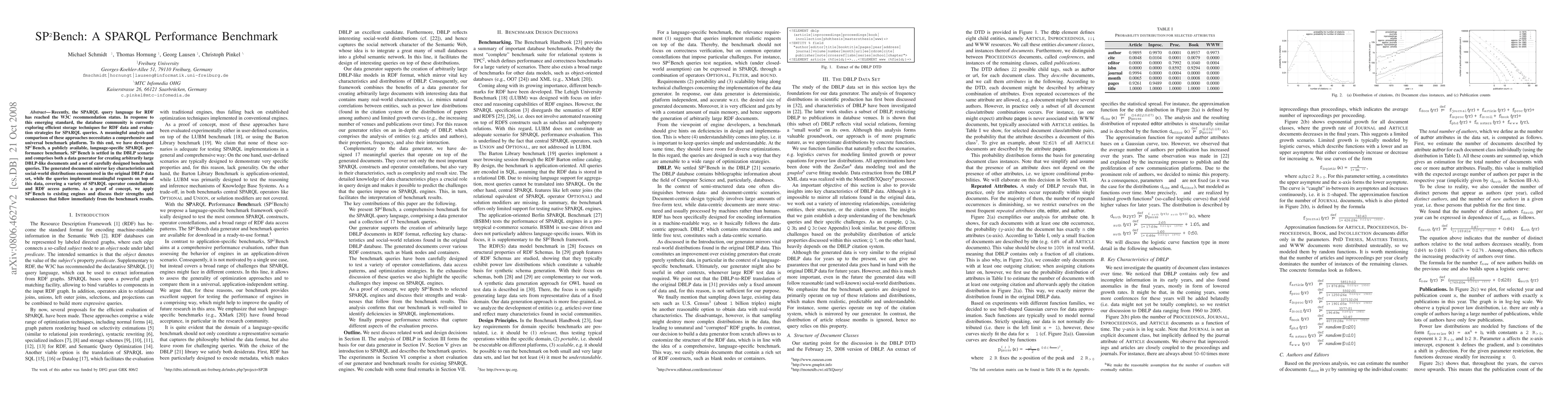 Recently, the SPARQL query language for RDF has reached the W3C recommendation status. In response to this emerging standard, the database community is currently exploring efficient storage techniques for RDF data and evaluation strategies for SPARQL queries. A meaningful analysis and comparison of these approaches necessitates a comprehensive and universal benchmark platform. To this end, we have developed SP^2Bench, a publicly available, language-specific SPARQL performance benchmark. SP^2Bench is settled in the DBLP scenario and comprises both a data generator for creating arbitrarily large DBLP-like documents and a set of carefully designed benchmark queries. The generated documents mirror key characteristics and social-world distributions encountered in the original DBLP data set, while the queries implement meaningful requests on top of this data, covering a variety of SPARQL operator constellations and RDF access patterns. As a proof of concept, we apply SP^2Bench to existing engines and discuss their strengths and weaknesses that follow immediately from the benchmark results.