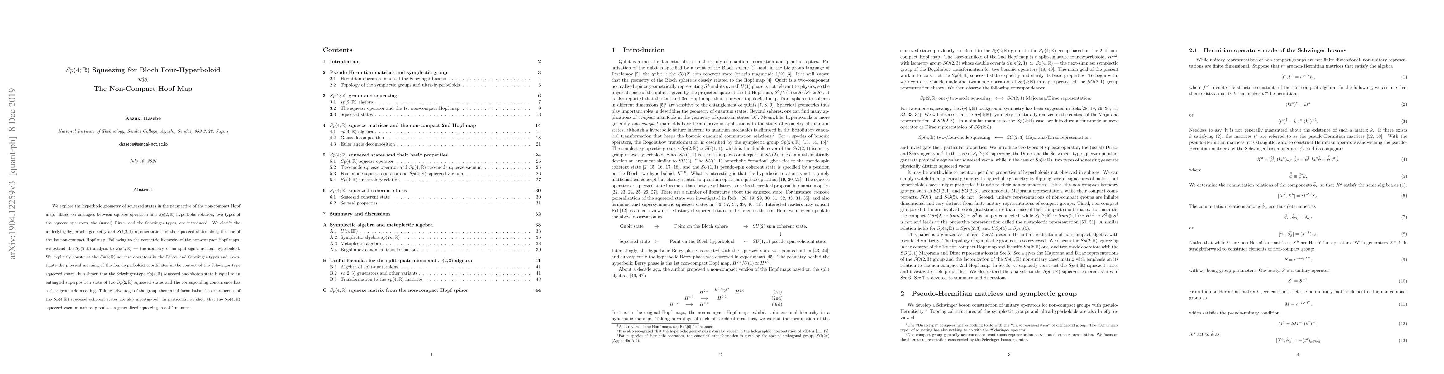 This paper investigates the hyperbolic geometry of squeezed states using the non-compact Hopf map, introducing Dirac- and Schwinger-type squeeze operators. It extends the $Sp(2;\mathbb{R})$ analysis to $Sp(4;\mathbb{R})$, constructing $Sp(4;\mathbb{R})$ squeeze operators and exploring their physical implications, particularly showing that the Schwinger-type $Sp(4;\mathbb{R})$ squeezed state is an entangled superposition of two $Sp(2;\mathbb{R})$ squeezed states.