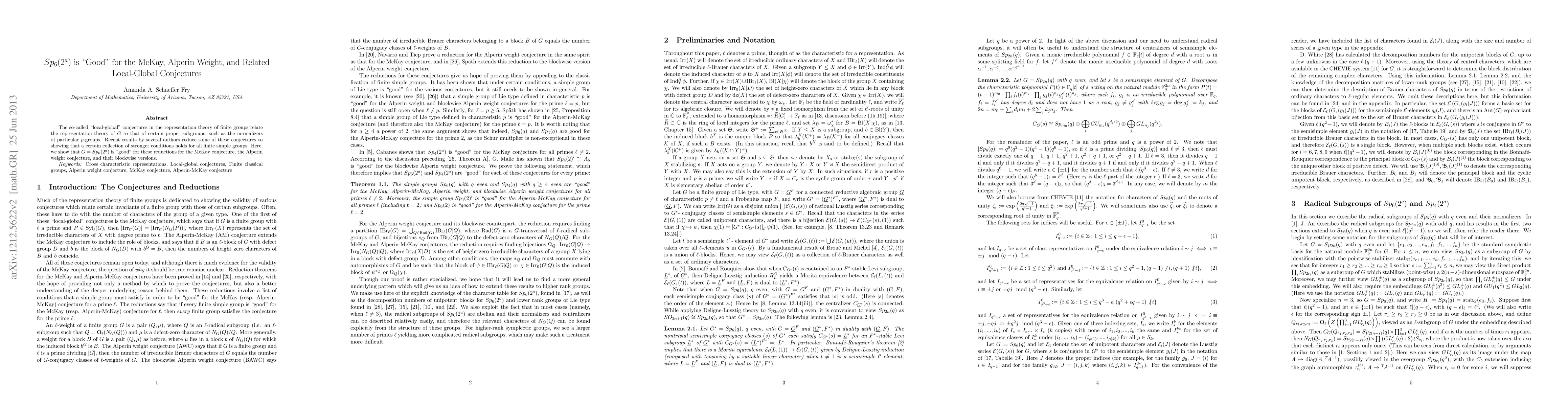 The so-called "local-global" conjectures in the representation theory of finite groups relate the representation theory of $G$ to that of certain proper subgroups, such as the normalizers of particular $p$-groups. Recent results by several authors reduce some of these conjectures to showing that a certain collection of stronger conditions holds for all finite simple groups. Here, we show that $G=Sp_6(2^a)$ is "good" for these reductions for the McKay conjecture, the Alperin weight conjecture, and their blockwise versions.