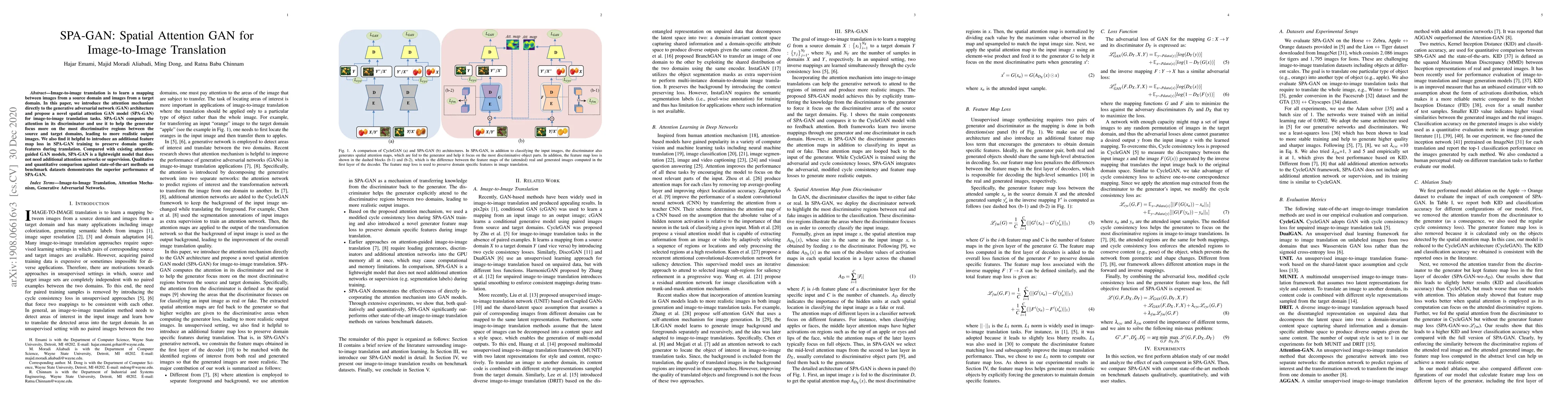 SPA-GAN introduces a spatial attention mechanism within a GAN architecture for improved image-to-image translation, focusing on discriminative regions to enhance realism. It also employs an additional feature map loss for feature preservation, outperforming existing models without requiring extra attention networks.