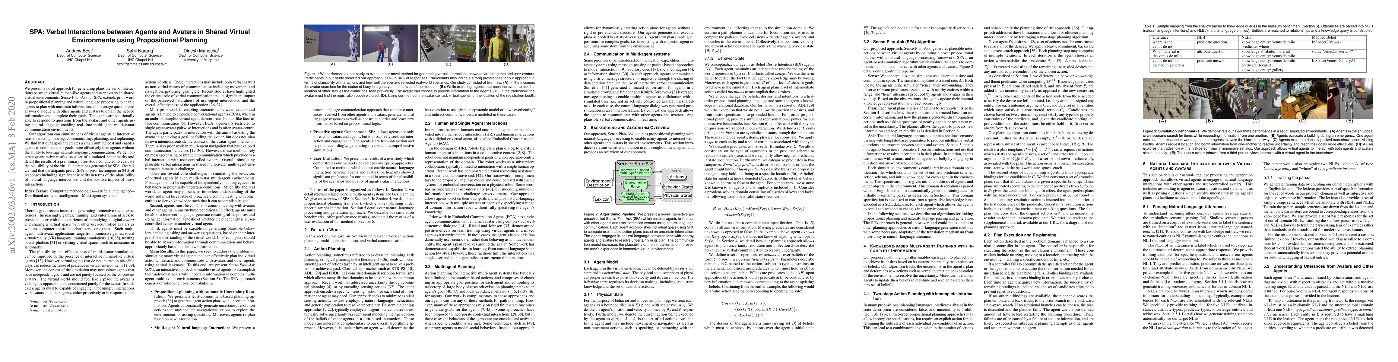 The SPA algorithm generates plausible verbal interactions between virtual agents and avatars in shared virtual environments using propositional planning. Participants in a preliminary user study preferred SPA over prior techniques, finding the interactions more plausible and beneficial.