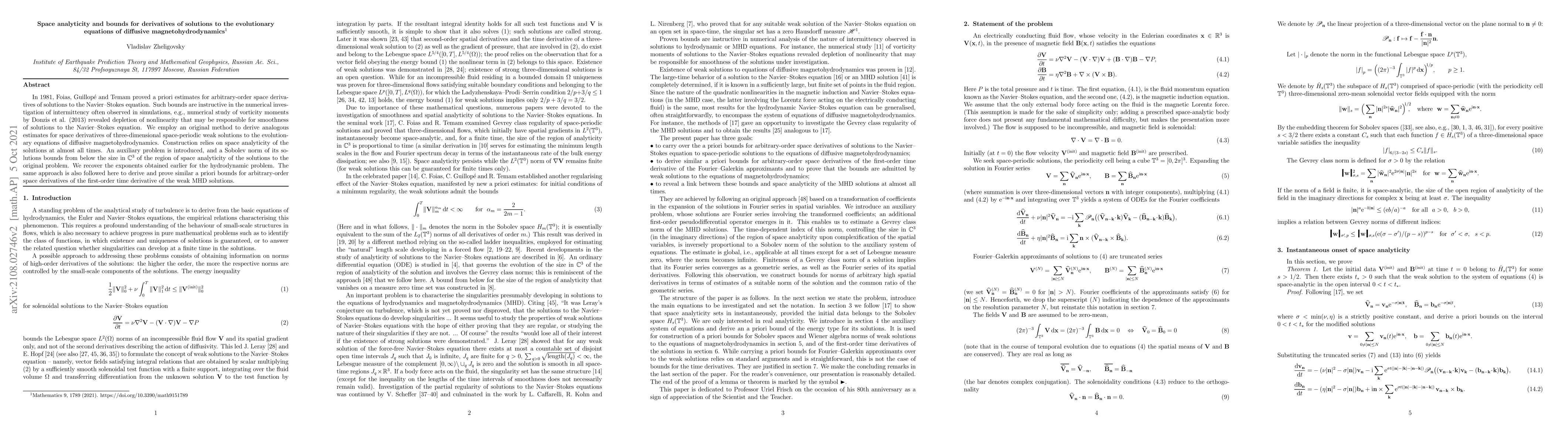 In 1981, Foias, Guillop\'e and Temam proved a priori estimates for arbitrary-order space derivatives of solutions to the Navier-Stokes equation. Such bounds are instructive in the numerical investigation of intermittency often observed in simulations, e.g., numerical study of vorticity moments by Donzis et al. (2013) revealed depletion of nonlinearity that may be responsible for smoothness of solutions to the Navier-Stokes equation. We employ an original method to derive analogous estimates for space derivatives of three-dimensional space-periodic weak solutions to the evolutionary equations of diffusive magnetohydrodynamics. Construction relies on space analyticity of the solutions at almost all times. An auxiliary problem is introduced, and a Sobolev norm of its solutions bounds from below the size in $C^3$ of the region of space analyticity of the solutions to the original problem. We recover the exponents obtained earlier for the hydrodynamic problem. The same approach is also followed here to derive and prove similar a priori bounds for arbitrary-order space derivatives of the first-order time derivative of the weak MHD solutions. This paper is dedicated to Professor Uriel Frisch on the occasion of his 80th anniversary as a sign of appreciation of the Scientist and the Teacher.