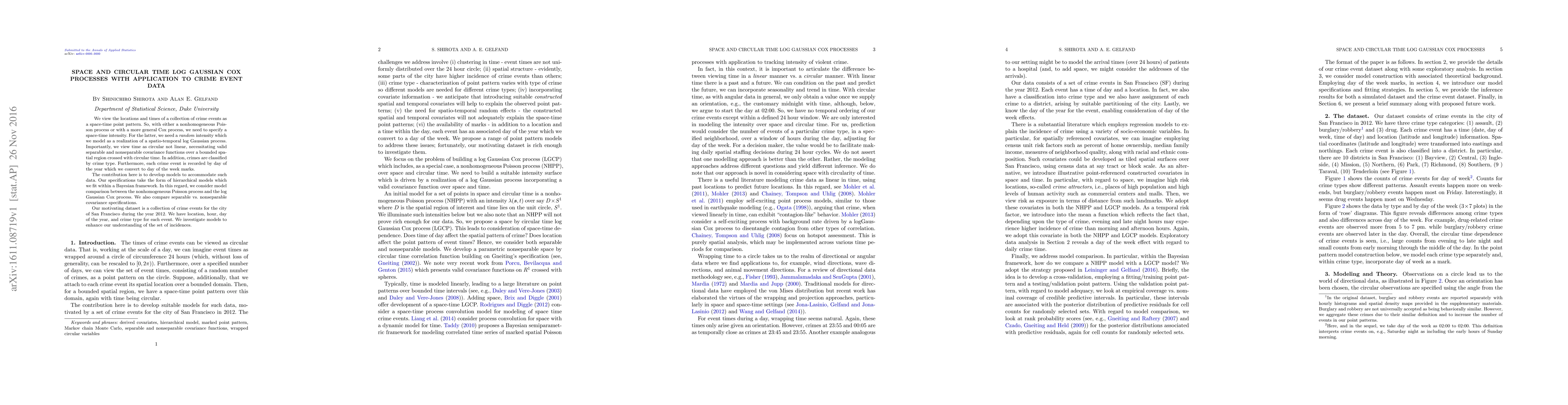 This research paper develops models to analyze crime event data in San Francisco, incorporating circular time and spatial intensity as a log Gaussian Cox process, with implications for understanding crime incidence patterns.