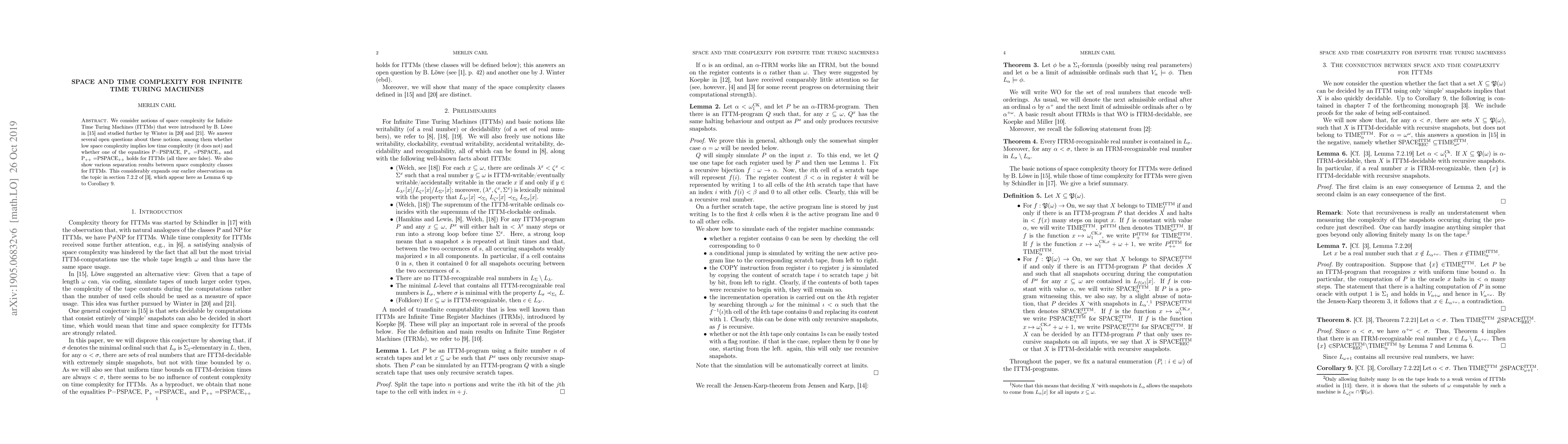 We consider notions of space complexity for Infinite Time Turing Machines (ITTMs) that were introduced by B. L\"owe and studied further by J. Winter. We answer several open questions about these notions, among them whether low space complexity implies low time complexity (it does not) and whether one of the equalities P=PSPACE, P$_{+}=$PSPACE$_{+}$ and P$_{++}=$PSPACE$_{++}$ holds for ITTMs (all three are false). We also show various separation results between space complexity classes for ITTMs. This considerably expands our earlier observations on the topic in section 7.2.2 of \cite{Ca2}, which appear here as Lemma $6$ up to Corollary $9$.