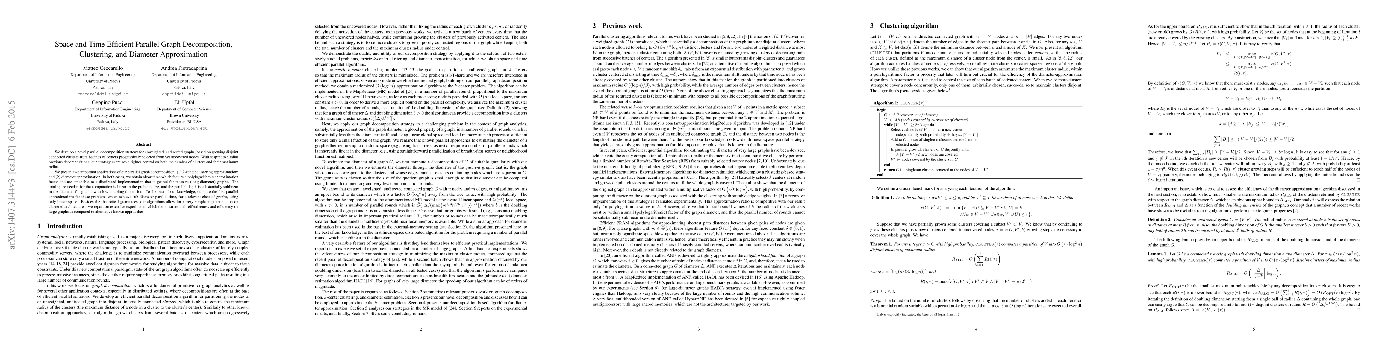 This paper introduces a novel parallel graph decomposition strategy that efficiently clusters unweighted, undirected graphs by growing connected clusters from selected node centers. The method achieves polylogarithmic approximation factors for $k$-center clustering and diameter approximation, using linear space and sublinear parallel depth, outperforming existing approaches on large graphs.
