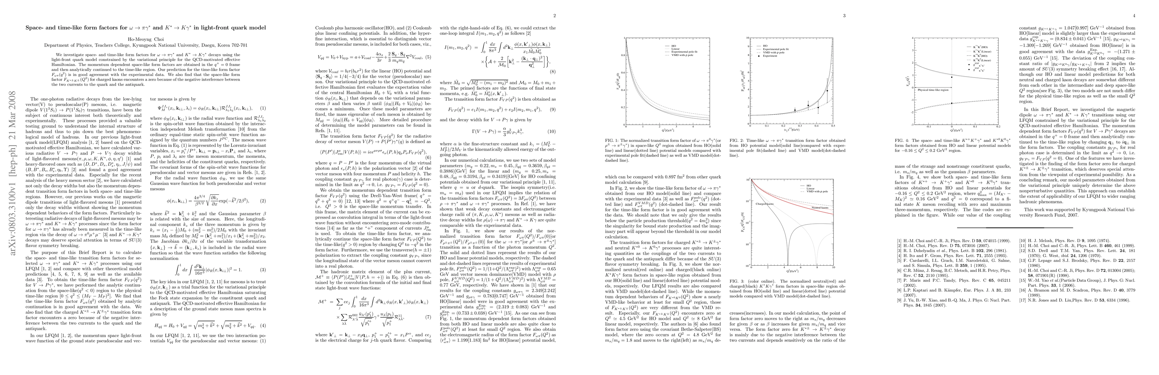 We investigate space- and time-like form factors for $\omega\to\pi\gamma^*$ and $K^*\to K\gamma^*$ decays using the light-front quark model constrained by the variational principle for the QCD-motivated effective Hamiltonian. The momentum dependent space-like form factors are obtained in the $q^+=0$ frame and then analytically continued to the time-like region. Our prediction for the time-like form factor $F_{\omega\pi}(q^2)$ is in good agreement with the experimental data. We also find that the space-like form factor $F_{K^{*\pm}K^{\pm}}(Q^2)$ for charged kaons encounters a zero because of the negative interference between the two currents to the quark and the antiquark.