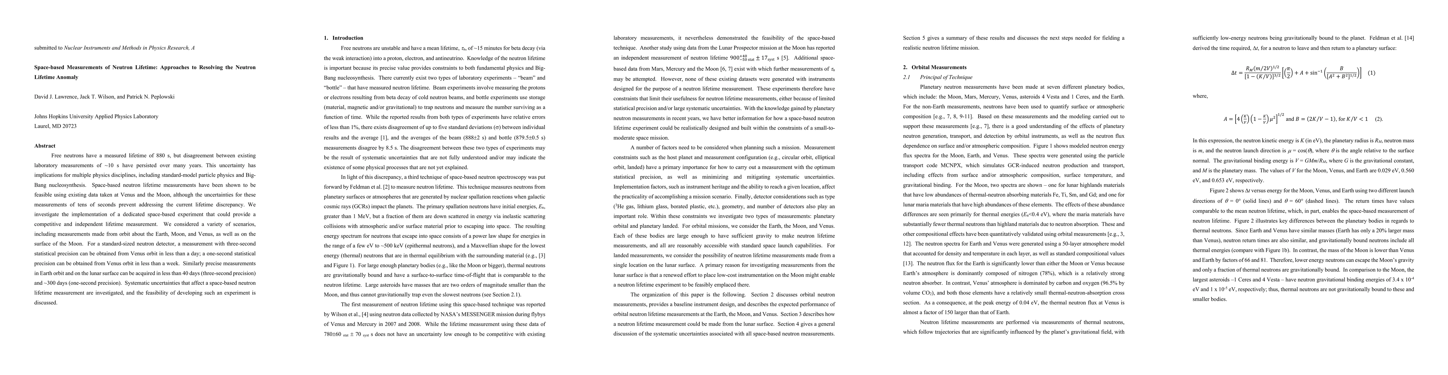 This paper explores the feasibility of space-based neutron lifetime measurements to resolve the longstanding discrepancy between laboratory measurements, proposing dedicated missions to Earth, Moon, and Venus orbits. A one-second precision measurement could be achieved in a week from Venus orbit, highlighting the potential for significant advancements in particle physics and cosmology.