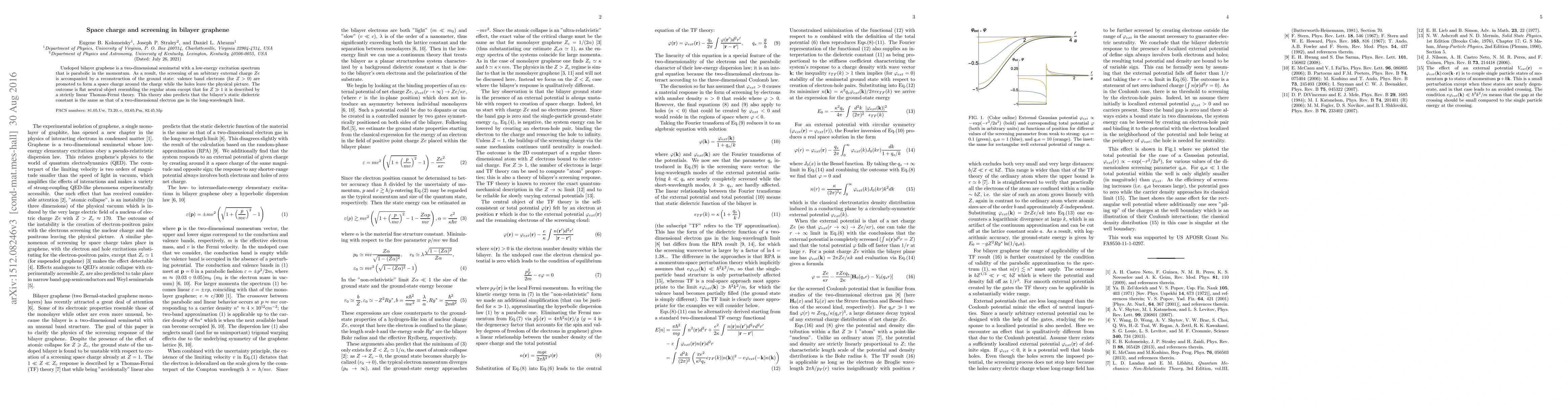 Undoped bilayer graphene is a two-dimensional semimetal with a low-energy excitation spectrum that is parabolic in the momentum. As a result, the screening of an arbitrary external charge $Ze$ is accompanied by a reconstruction of the ground state: valence band electrons (for $Z>0$) are promoted to form a space charge around the charge while the holes leave the physical picture. The outcome is flat neutral object resembling the regular atom except that for $Z \gg 1$ it is described by a strictly linear Thomas-Fermi theory. This theory also predicts that the bilayer's static dielectric constant is the same as that of a two-dimensional electron gas in the long-wavelength limit.