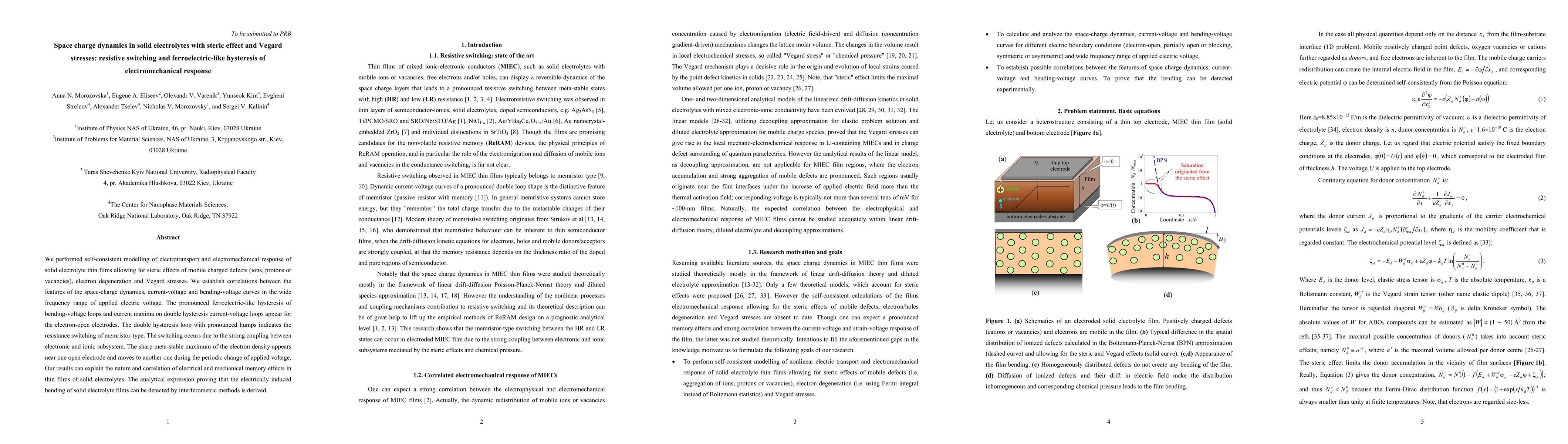 This paper models the electrotransport and electromechanical response of solid electrolyte thin films, revealing ferroelectric-like hysteresis and memristor-type resistive switching due to space charge dynamics influenced by steric effects and Vegard stresses. Analytical expressions show that electric-induced bending can be detected interferometrically.