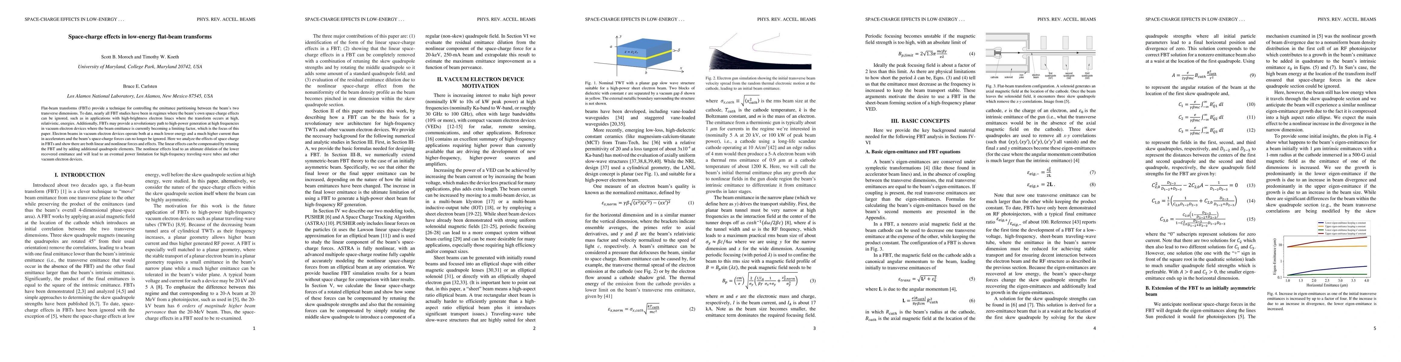 The research analyzes space-charge effects in low-energy flat-beam transforms (FBTs) using codes PUSHER and ASTRA. It models an elliptical beam with tilt, considering both linear and nonlinear space-charge forces.