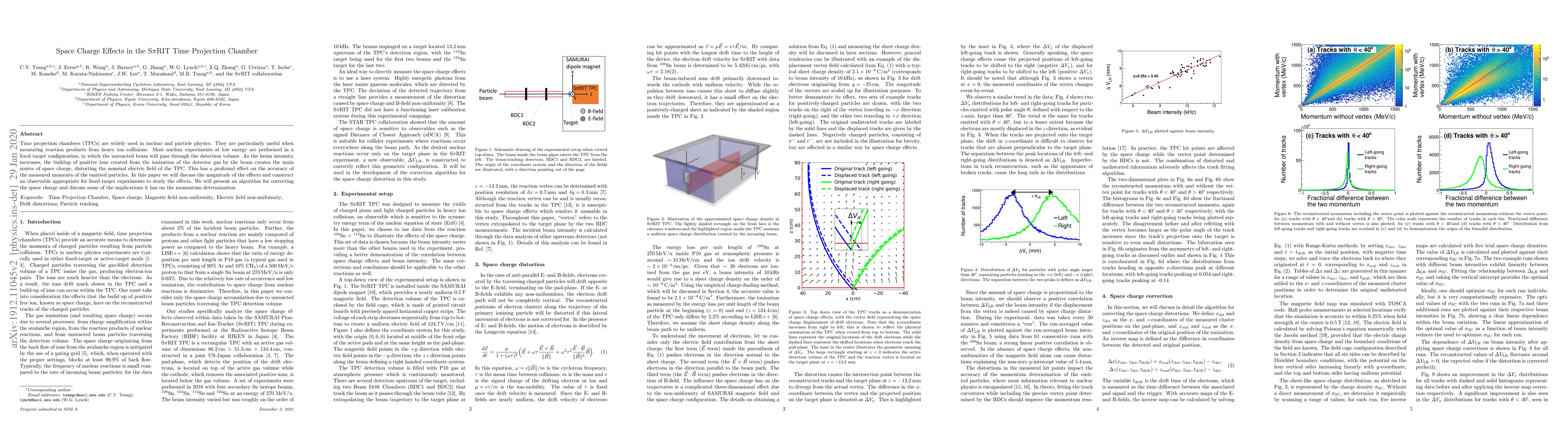 This paper investigates space charge effects in the S$\pi$RIT Time Projection Chamber, focusing on the distortions caused by positive ions from the beam, which impact particle momentum measurements. It proposes an observable and a correction algorithm to mitigate these effects, enhancing the accuracy of fixed target experiments.