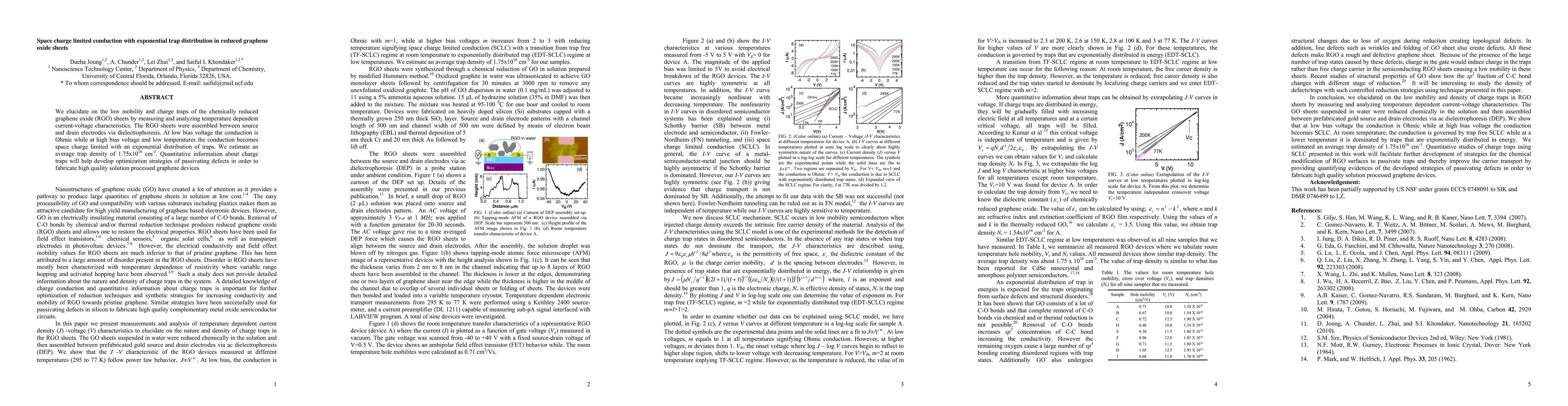 We elucidate on the low mobility and charge traps of the chemically reduced graphene oxide (RGO) sheets by measuring and analyzing temperature dependent current-voltage characteristics. The RGO sheets were assembled between source and drain electrodes via dielectrophoresis. At low bias voltage the conduction is Ohmic while at high bias voltage and low temperatures the conduction becomes space charge limited with an exponential distribution of traps. We estimate an average trap density of 1.75x10^16 cm^-3. Quantitative information about charge traps will help develop optimization strategies of passivating defects in order to fabricate high quality solution processed graphene devices.