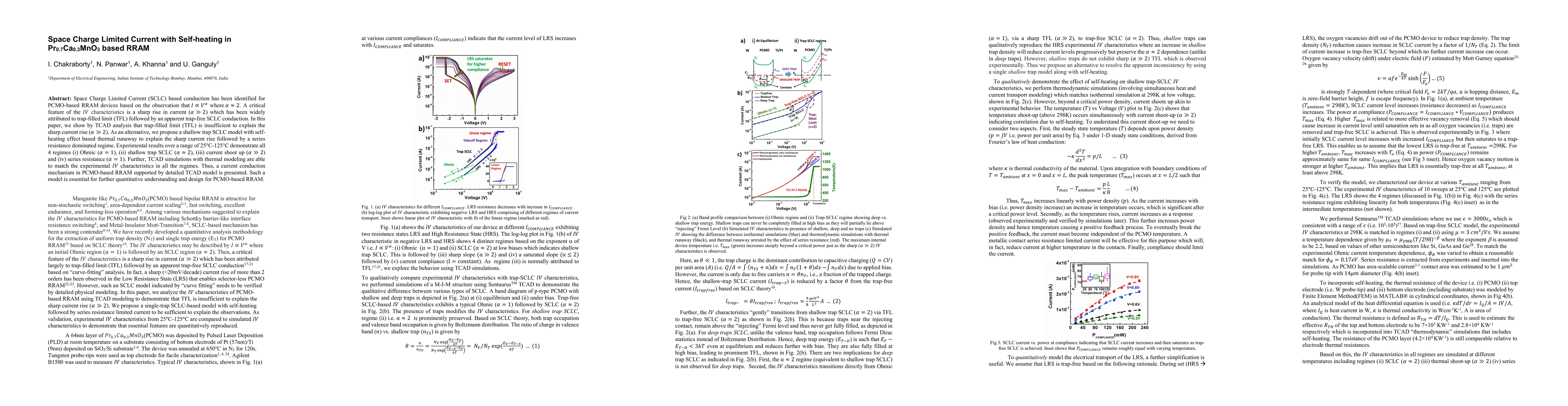 Space Charge Limited Current (SCLC) based conduction has been identified for PCMO-based RRAM devices based on the observation that $I \propto V^{\alpha}$ where $\alpha \approx 2$. A critical feature of the IV characteristics is a sharp rise in current ($\alpha \gg 2$) which has been widely attributed to trap-filled limit (TFL) followed by an apparent trap-free SCLC conduction. In this paper, we show by TCAD analysis that trap-filled limit (TFL) is insufficient to explain the sharp current rise ($\alpha \gg 2$). As an alternative, we propose a shallow trap SCLC model with selfheating effect based thermal runaway to explain the sharp current rise followed by a series resistance dominated regime. Experimental results over a range of 25{\deg}C-125{\deg}C demonstrate all 4 regimes (i) Ohmic ($\alpha = 1$), (ii) shallow trap SCLC ($\alpha \approx 2$), (iii) current shoot up ($\alpha \gg 2$) and (iv) series resistance ($\alpha = 1$). Further, TCAD simulations with thermal modeling are able to match the experimental IV characteristics in all the regimes. Thus, a current conduction mechanism in PCMO-based RRAM supported by detailed TCAD model is presented. Such a model is essential for further quantitative understanding and design for PCMO-based RRAM.