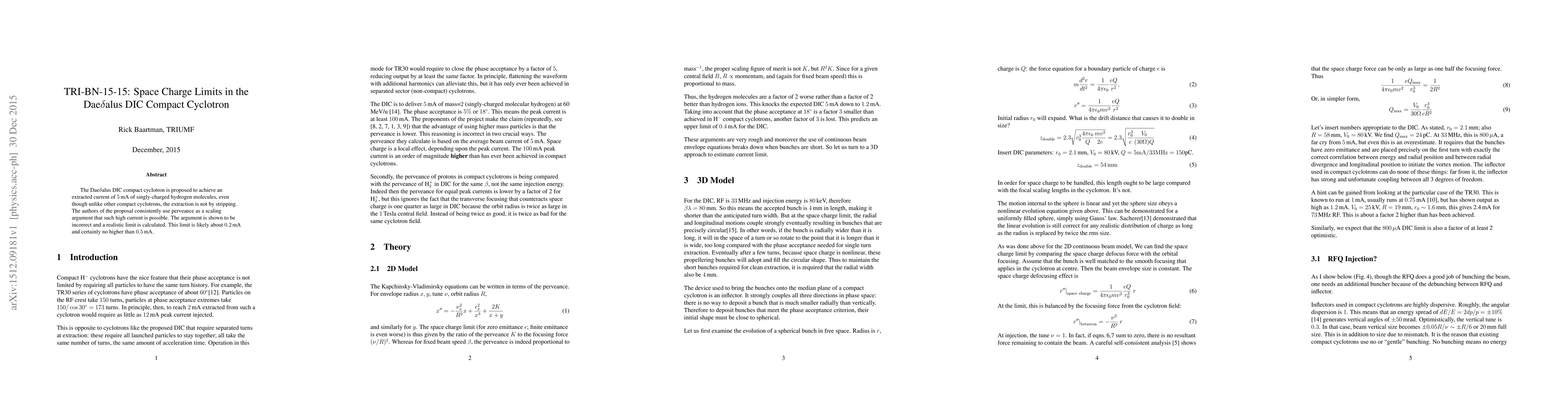 The Dae$\delta$alus DIC compact cyclotron aims for an extracted current of 5 mA of singly-charged hydrogen molecules without stripping, but the proposed perveance-based scaling argument is shown to be incorrect. The realistic space charge limit is estimated to be around 0.2 mA, not exceeding 0.5 mA.